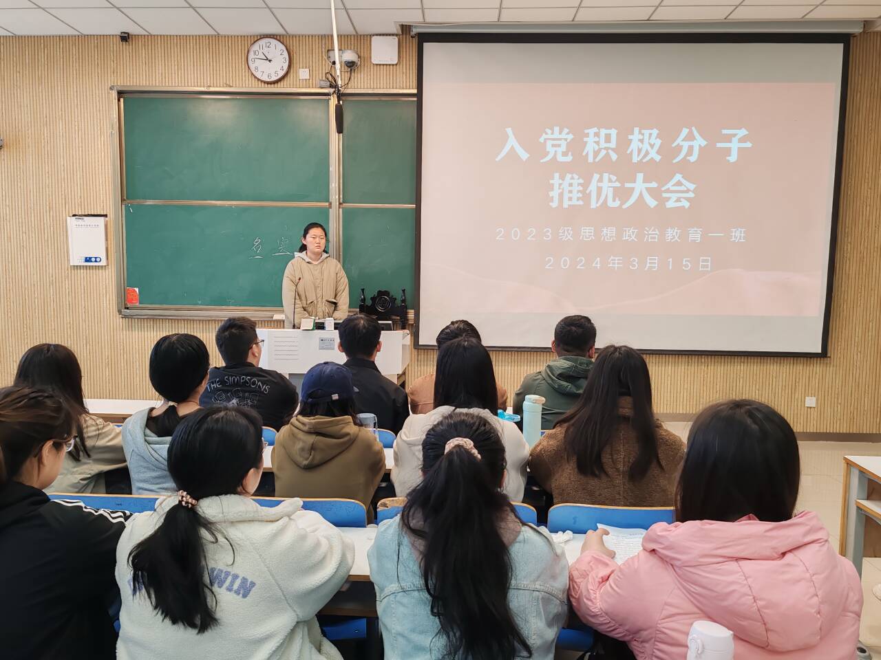 为使支部团员积极向党组织靠拢,深刻学习党的思想,加强支部团员的积极性,向党组织输送新鲜血液,3月15日上午,sjb世俱杯网站2023级思想政治教育一班团支部在社科楼515教室召开入党积极分子推优大会。世俱杯官网专职辅导员沈海蓄和2023级思想政治教育一班全体团员出席本次大会,大会由团支书张卓主持。