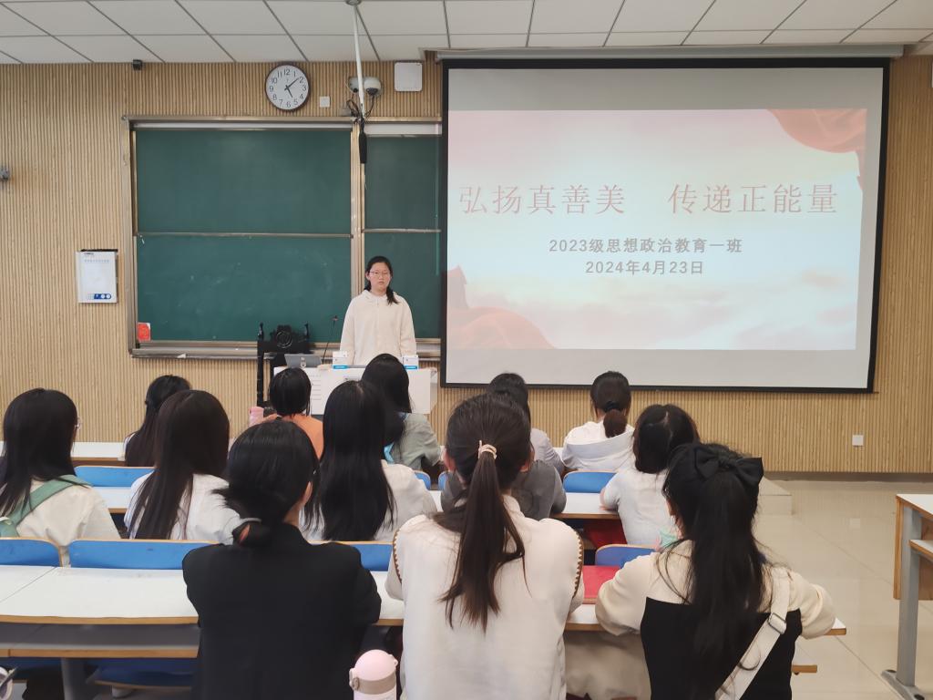 为引导我班学子坚定理想信念,厚植爱党爱国情怀,传递真善美的力量,4月23日下午,sjb世俱杯网站2023级思想政治教育一班在社科楼515教室召开“弘扬真善美,传递正能量”主题团课。世俱杯官网2023级思想政治教育一班全体同学共同参与本次班会,班会由团支书张卓主持。