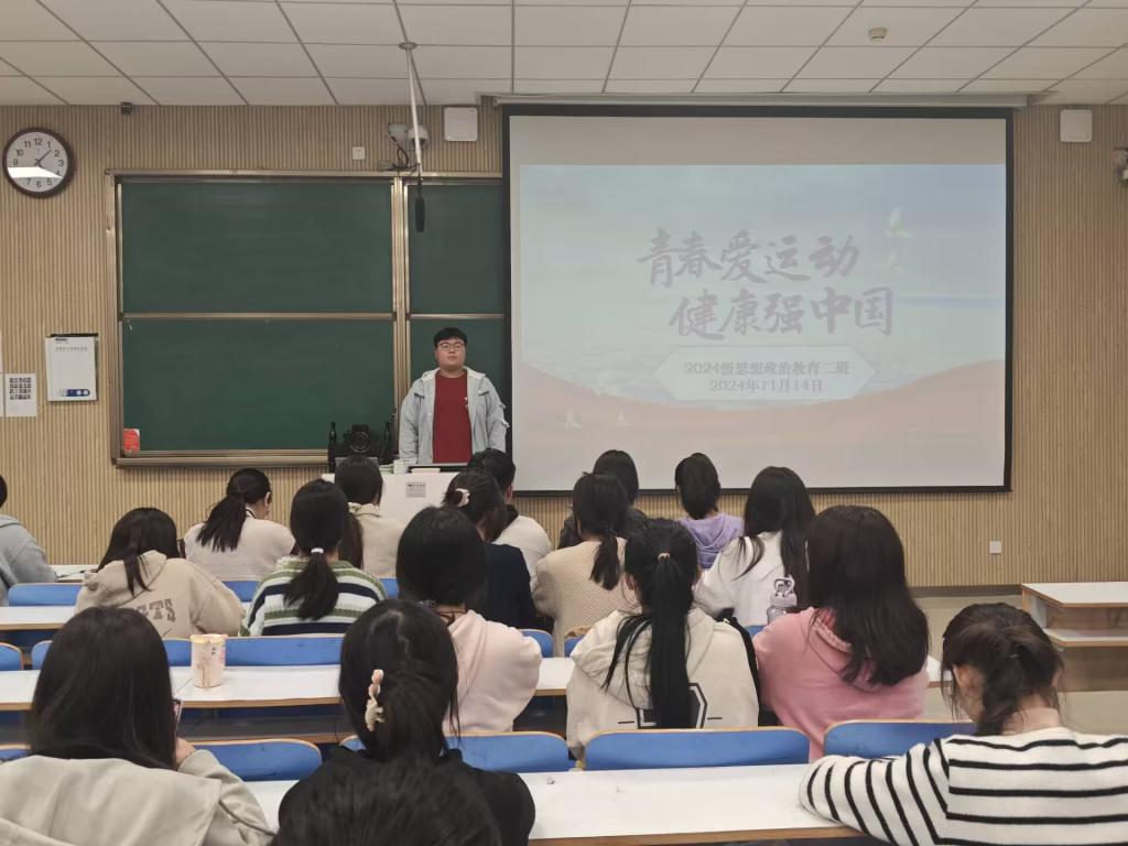 为响应国家大力推进体育强国建设的号召,同时激发同学们参与运动的热情,培养良好的运动习惯和生活方式, 11月14日下午,sjb世俱杯网站 2024 级思想政治教育二班于社科楼515教室举办了 “青春爱运动,健康强中国”主题团课活动。此次团课由团支书王志颖主持,二班全体同学共同参与。