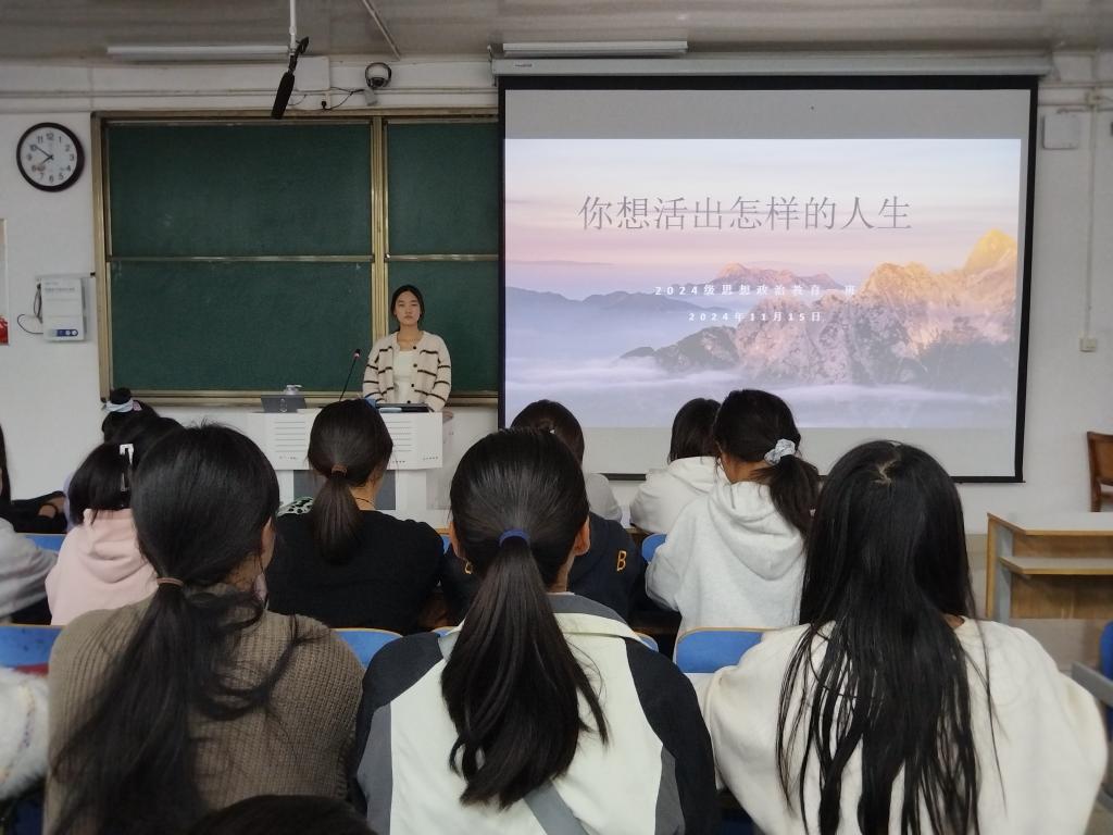 为帮助我班学生更好地理解人生意义,树立正确的价值观和人生观,11月15日上午,2024级思想政治教育一班在社科楼515教室开展“你想活出怎样的人生”主题班会。本次班会由班长李冉主持,一班全体同学参加。