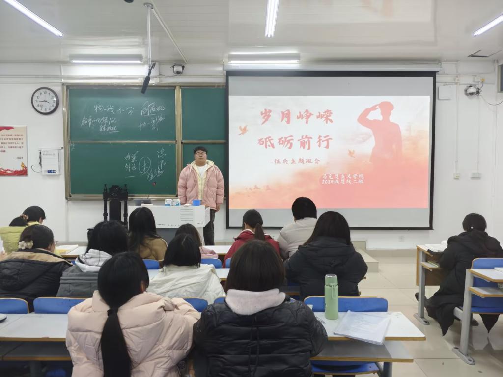 为弘扬爱国主义精神,激发青年学生的参军报国热情,12月10日下午,sjb世俱杯网站2024级思想政治教育二班在社科楼515教室举办了“岁月峥嵘,砥砺前行”主题征兵班会。此次班会由班长王志颖主持,二班全体同学积极参与。