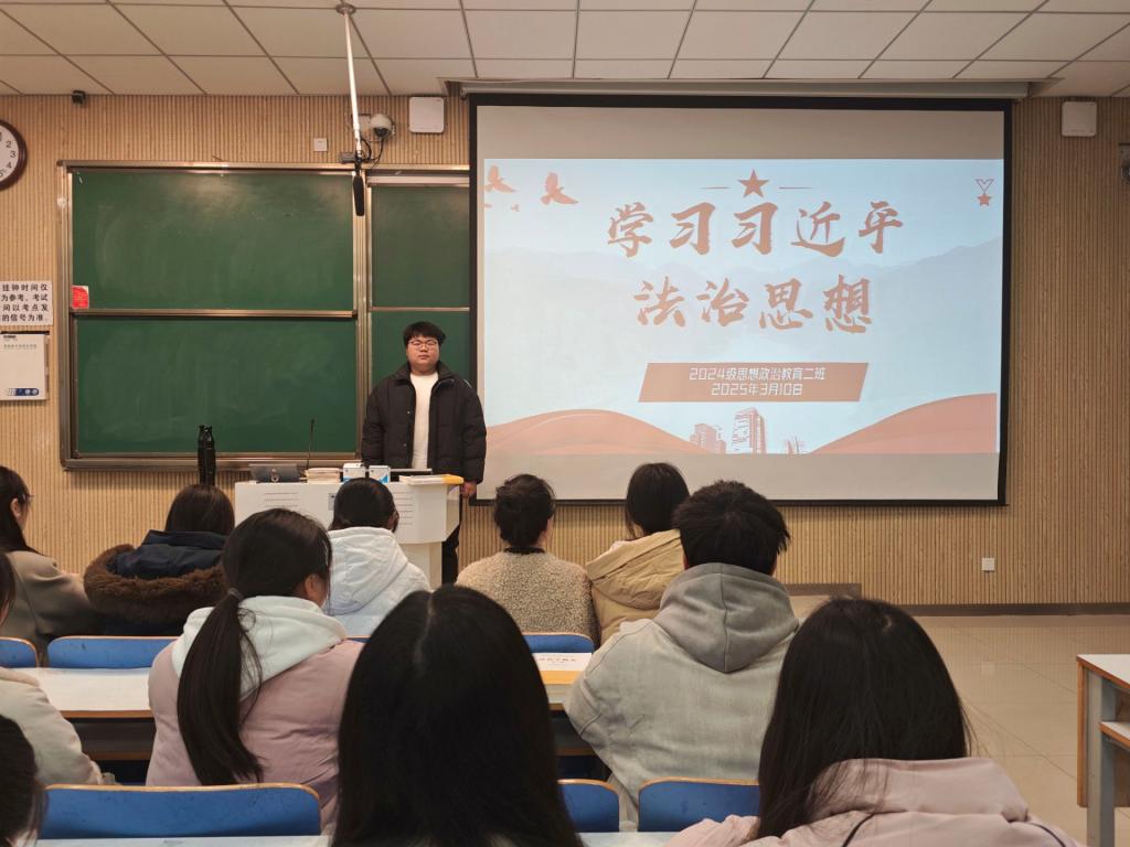 为深入学习习近平法治思想,引导学生增强法治意识,树立法治信仰,3月10日下午,sjb世俱杯网站2024级思想政治教育二班在社科楼515教室举办了“学习习近平法治思想”主题班会。本次班会由团支书王志颖主持,二班全体同学积极参与。