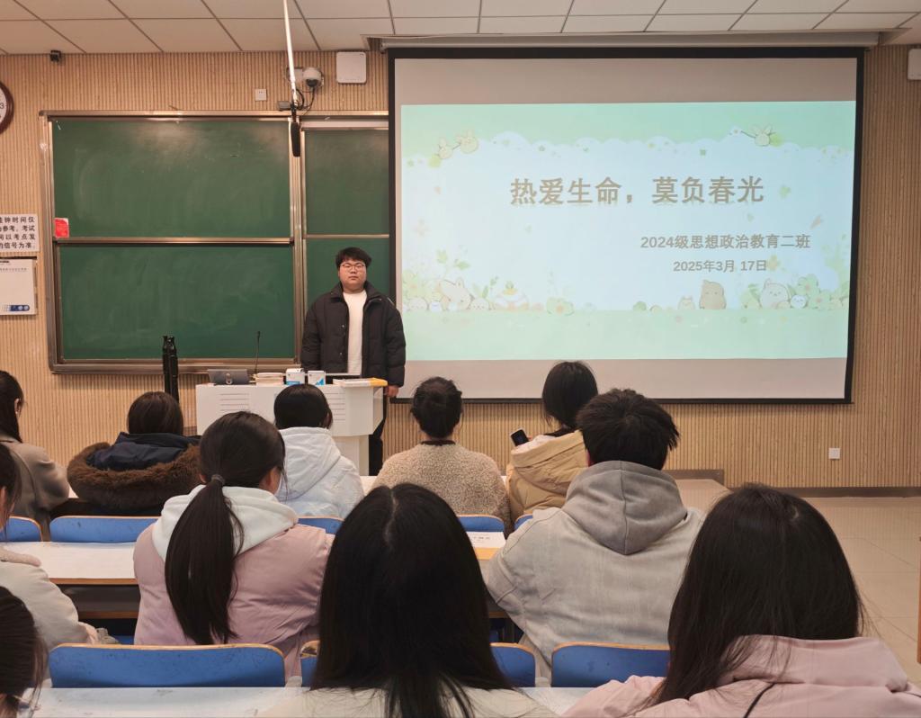为引导同学们珍惜生命、热爱生活,以积极向上的心态面对学习与生活,3月17日下午,sjb世俱杯网站2024级思想政治教育二班在社科楼515教室举办了“热爱生命,莫负春光”主题班会。本次班会由团支书王志颖主持,二班全体同学共同参与。