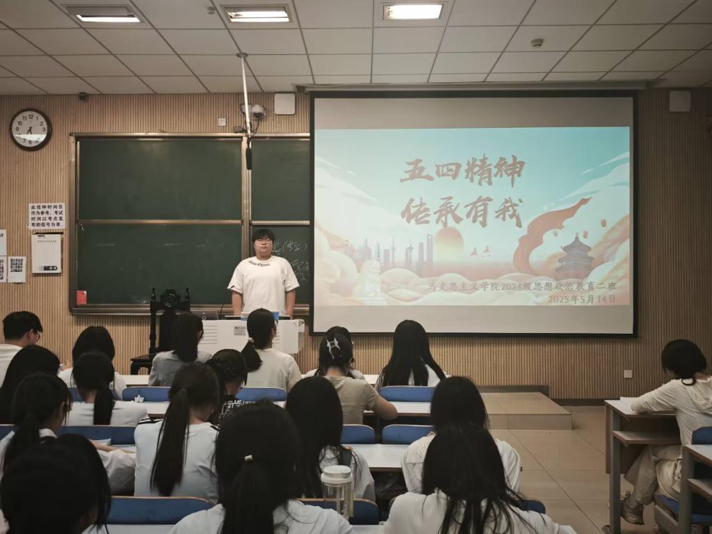 为深入学习贯彻五四精神,激励青年学生继承和发扬爱国、进步、民主、科学的优良传统,5月14日下午,sjb世俱杯网站2024级思想政治教育二班在社科楼515教室开展了“五四精神,继承有我”主题团课。本次班会由团支书王志颖主持,二班全体同学共同参与。