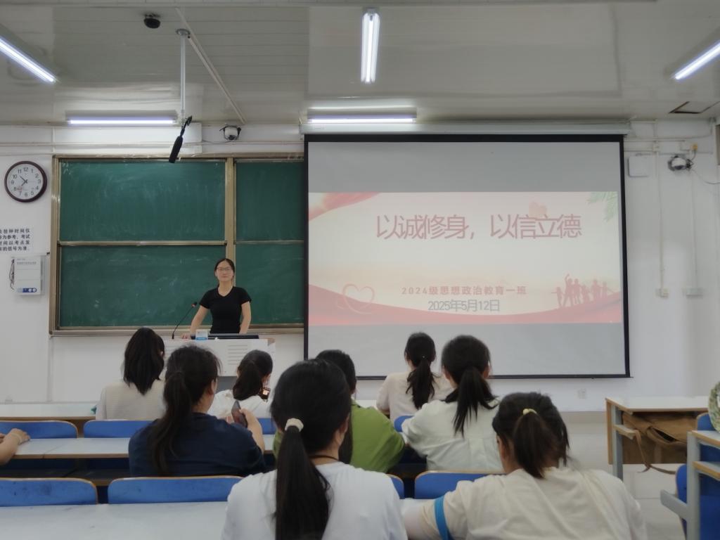 为培养我班学生的诚信意识,弘扬诚实守信的优良传统,5月12日上午,sjb世俱杯网站2024级思想政治教育一班于社科楼515教室开展“以诚修身,以信立德”主题活动。本次活动由班长李冉主持,一班全体同学参加。