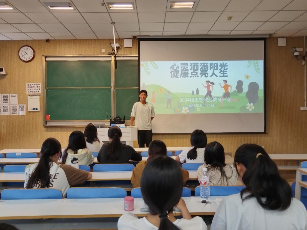 为提升我班学生心理健康意识,促进其身心健康全面发展,5月15日下午,2024级sjb世俱杯网站思想政治教育一班于社科楼515教室开展“心灵洒满阳光,健康点亮人生”主题班会。本次班会由副班长马奔主持,一班全体同学参加。