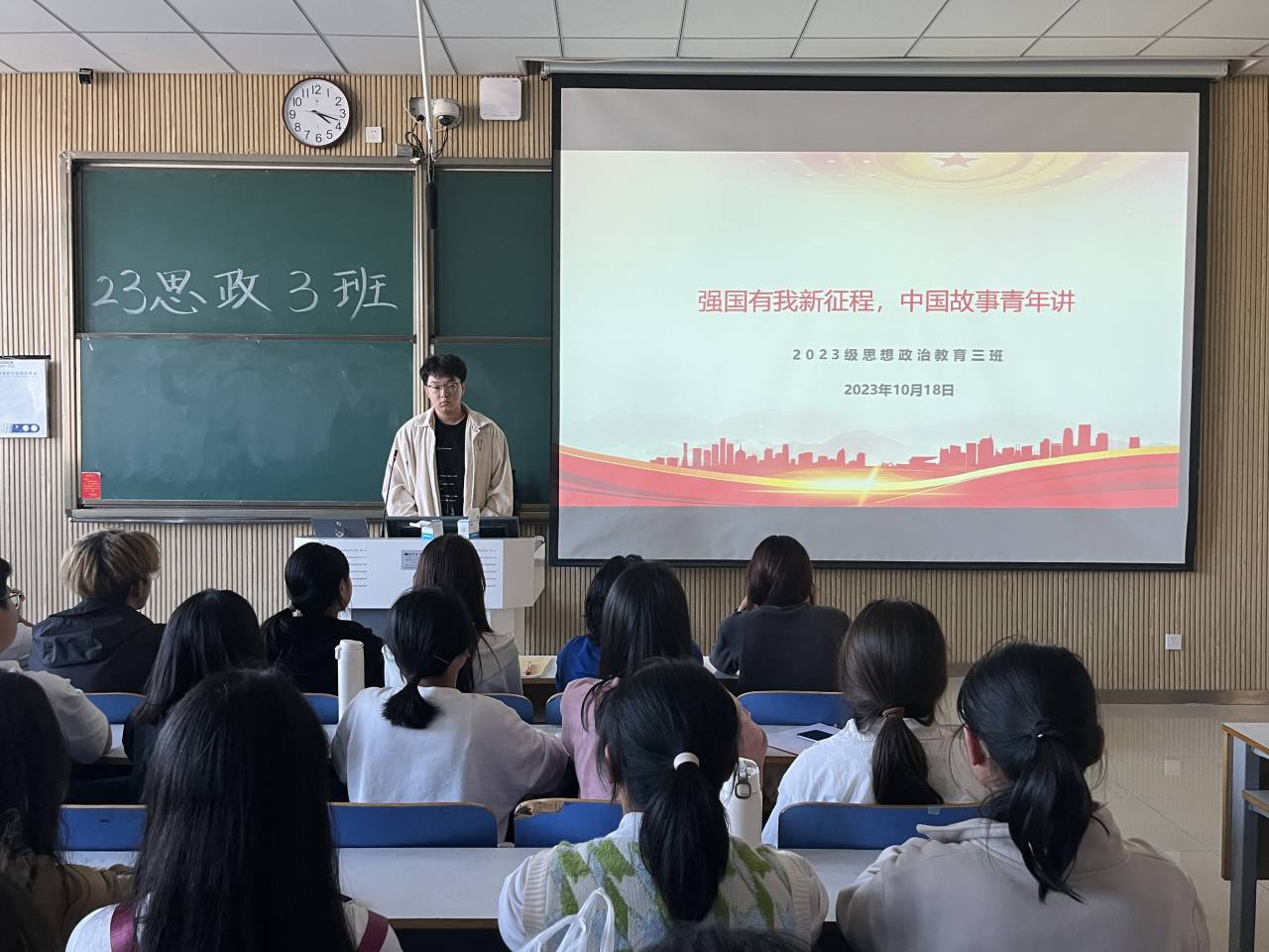 10月18日上午,sjb世俱杯网站2023级思想政治教育三班在社科楼514教室召开“强国有我新征程,中国故事青年讲”主题团课。世俱杯官网2023级思想政治教育三班全体成员共同参加此次团课,团课由团支书郝瀚主持。