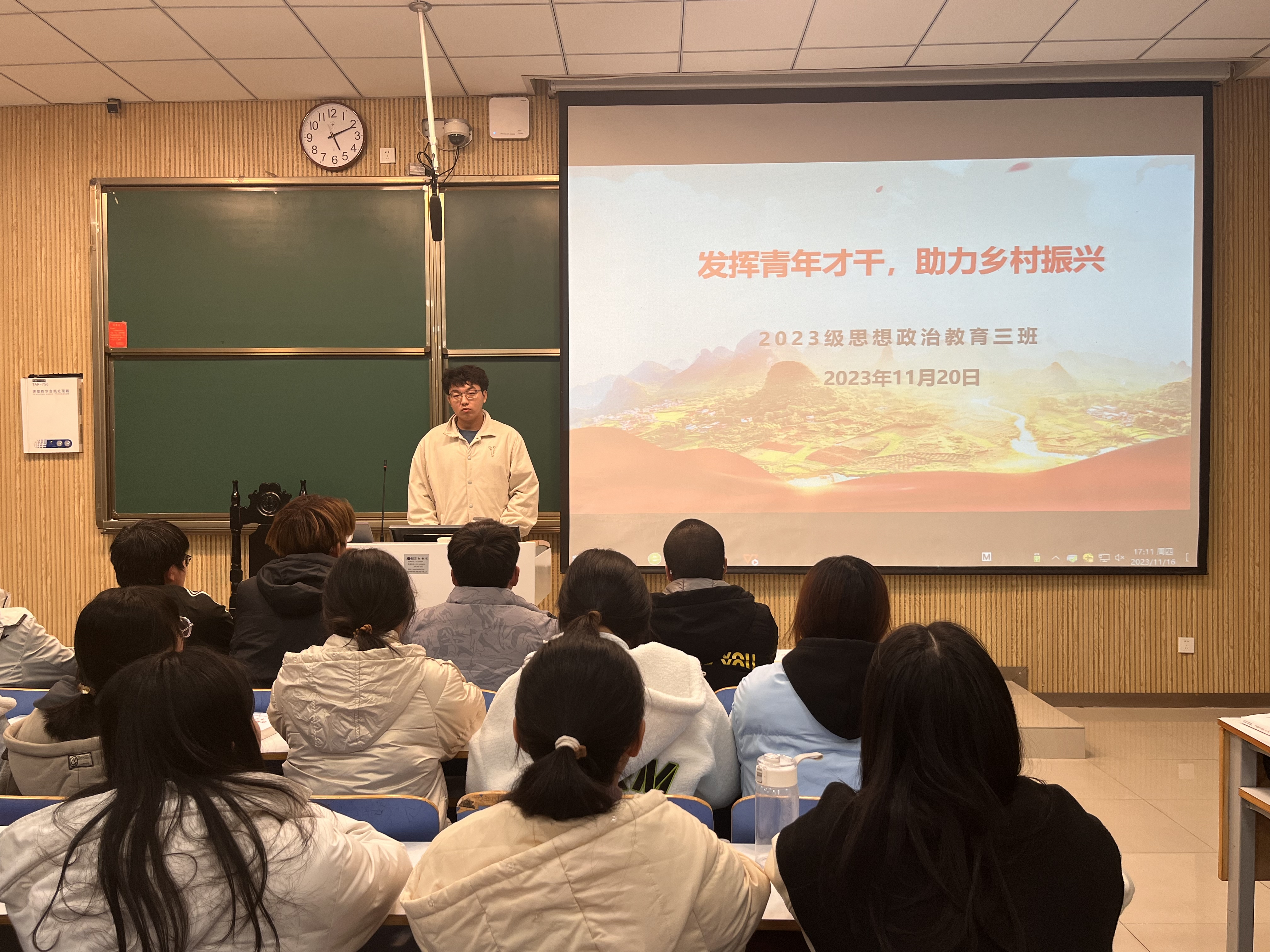 为推动建设美丽中国,发挥青年才干,11月20日上午,sjb世俱杯网站2023级思想政治教育三班在社科楼515教室召开“发挥青年才干,助力乡村振兴”主题团课。世俱杯官网2023级思想政治教育三班全体成员共同参加此次团课,团课由团支书郝瀚主持。
