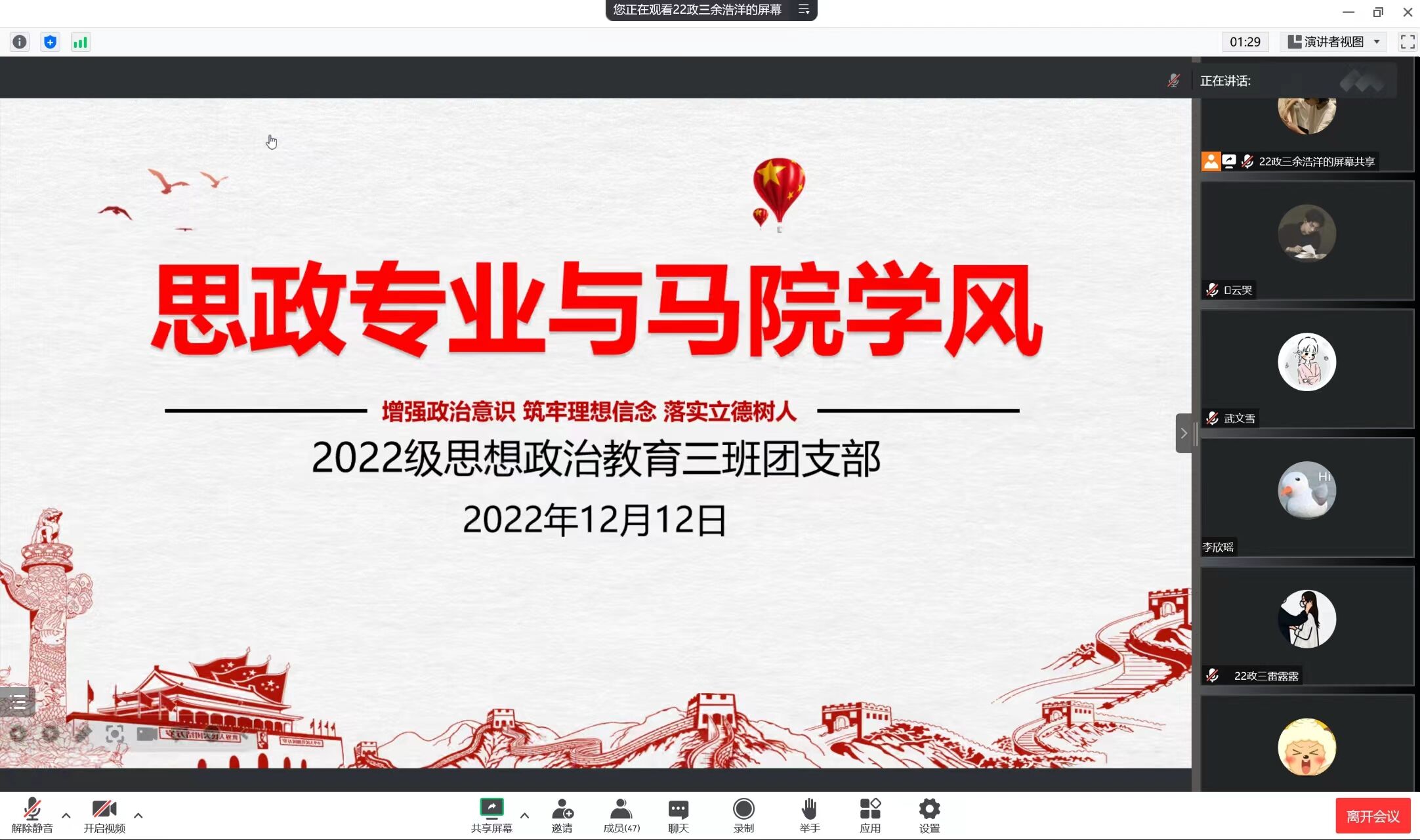 筑牢理想信念,落实立德树人。为建设创新型思政专业,打造优良的马院学风,12月12日上午,sjb世俱杯网站2022级思想政治教育三班在线上召开“思政专业与马院学风”主题团课。2022级思想政治教育三班全体成员共同参与团课,团课由团支书余浩洋主持。