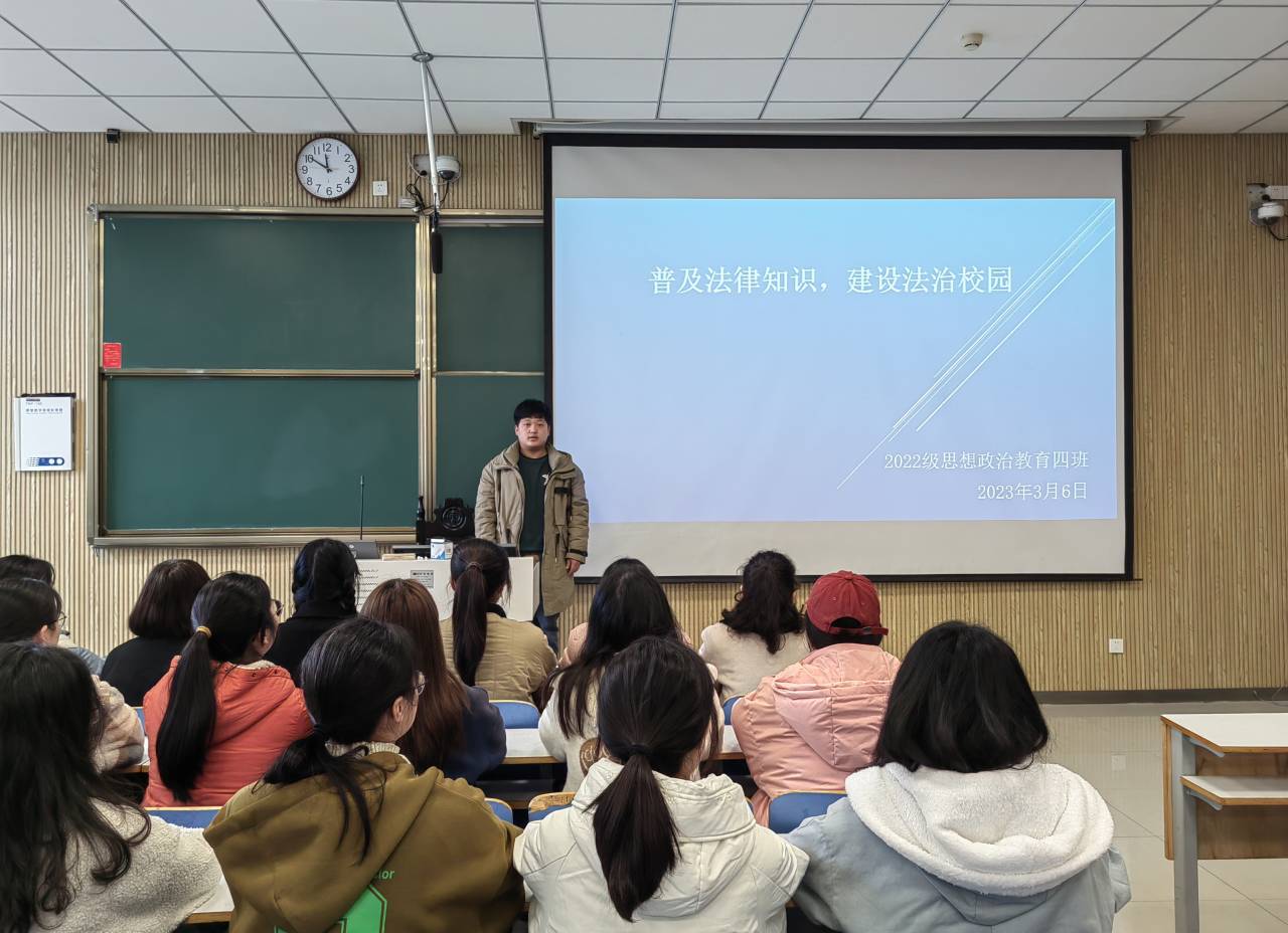 为引导同学们强化法治观念,提高守法意识,3月6日上午,sjb世俱杯网站2022级思想政治教育四班在社科楼515教室召开“普及法律知识,建设法治校园”主题班会,2022级思想政治教育四班全体同学参加本次班会。会议由副班长宋奕铭主持。
