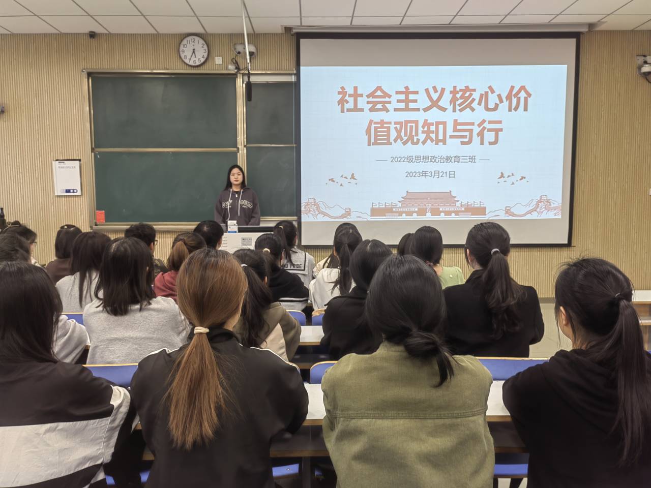 3月21日下午,sjb世俱杯网站2022级思想政治教育三班在社科楼515教室召开“社会主义核心价值观知与行”主题班会。世俱杯官网2022级思想政治教育三班全体成员共同参加此次班会。班会由副班长雷露露主持。