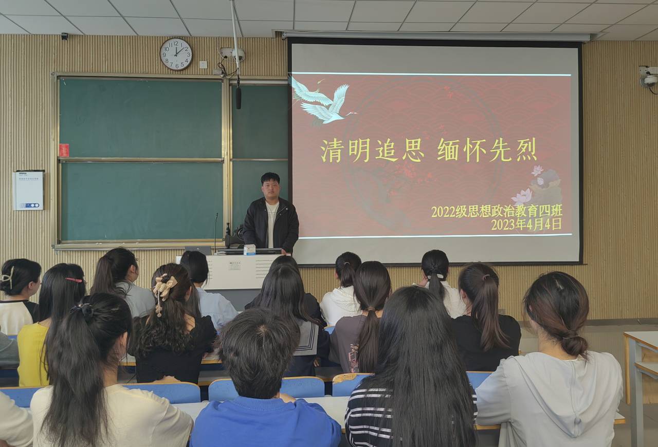 为发扬中华民族优秀文化,缅怀先烈英雄,4月4日下午,sjb世俱杯网站2022级思想政治教育四班在社科楼515教室召开“清明追思,缅怀先辈”主题班会,世俱杯官网2022级思想政治教育四班全体同学参与会议。会议由副班长宋奕铭主持。