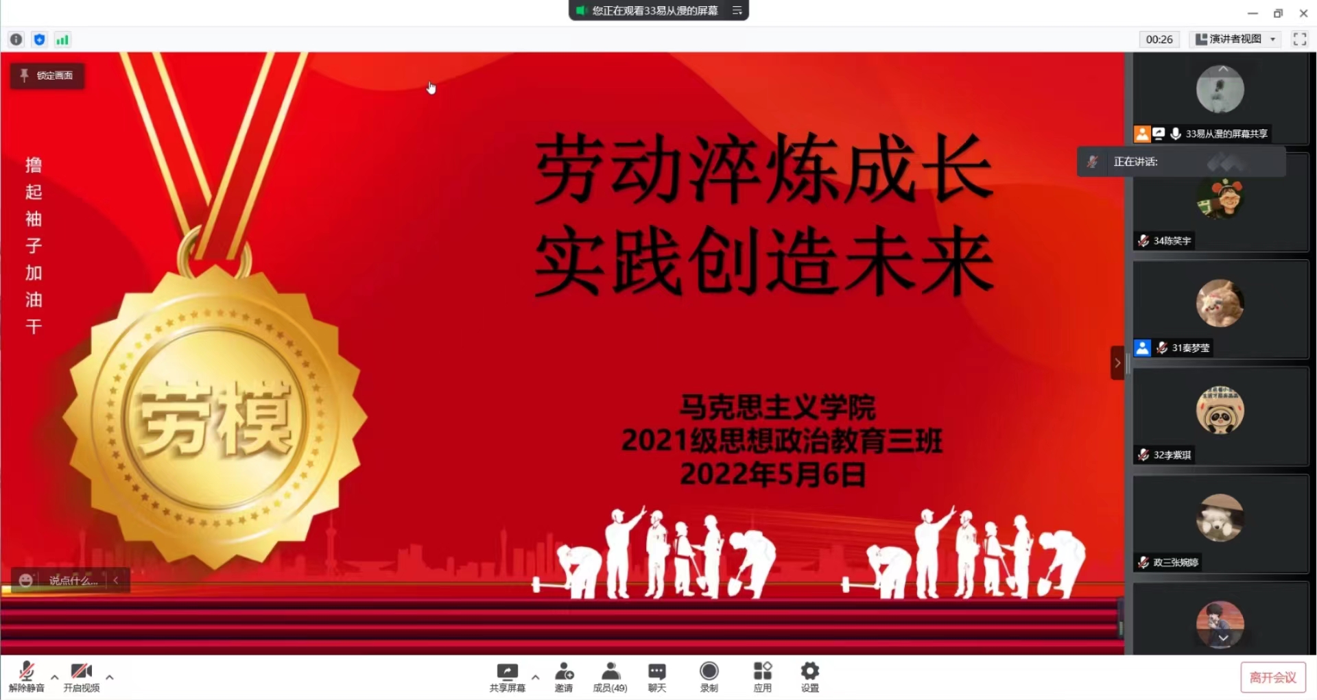 5月6日下午,sjb世俱杯网站2021级思想政治教育三班召开线上“劳动淬炼成长,实践创造未来”主题班会。2021级思想政治教育三班全体成员参与本次会议。会议由副班长兼劳动委员易从漫主持。
