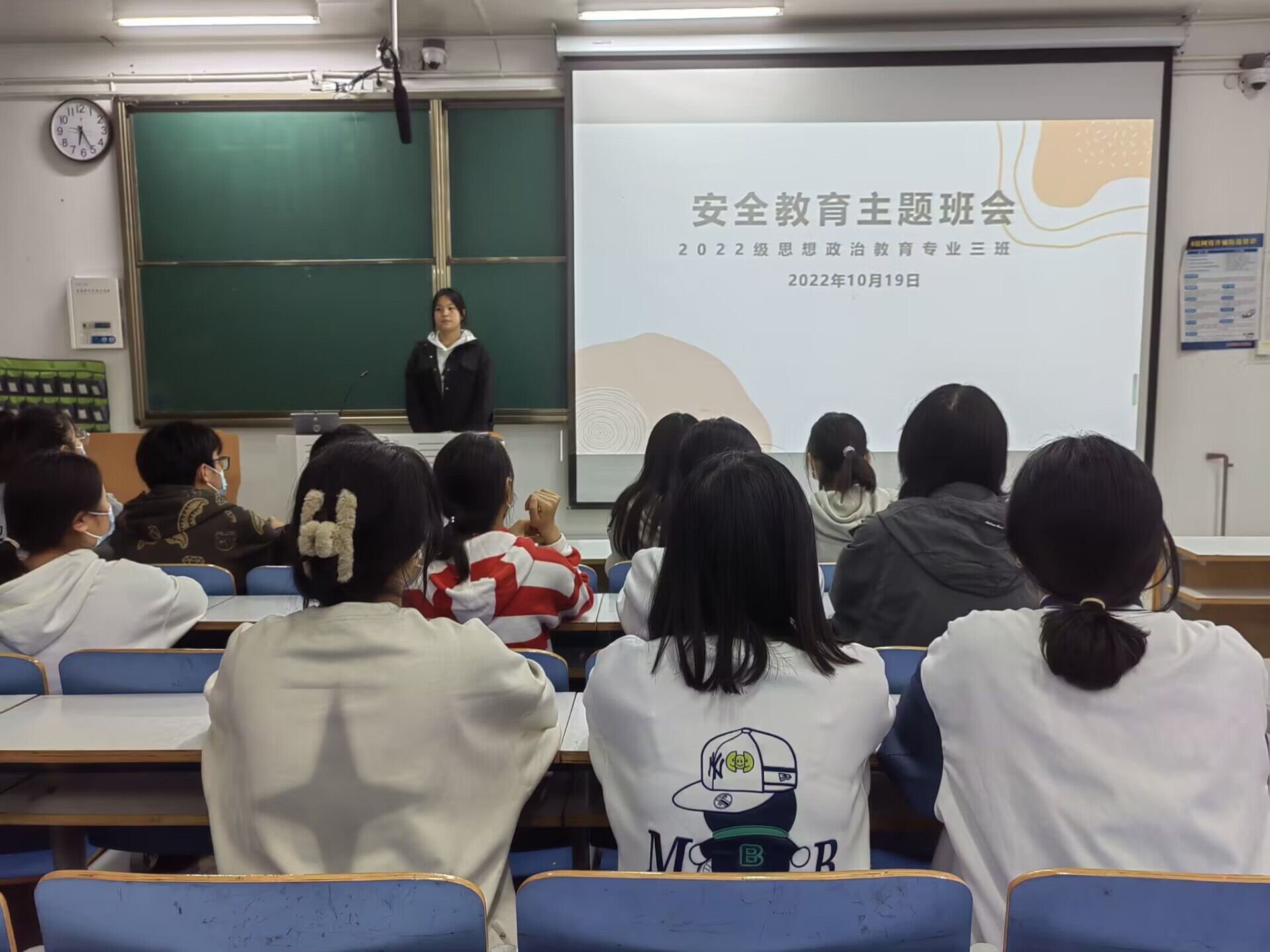 为增强大学生安全防范意识,提高安全防范和自我保护能力,10月19日下午,sjb世俱杯网站2022级思想政治教育三班在社科楼515教室召开安全教育主题班会。2022级思想政治教育三班全体成员参加会议,会议由副班长雷露露主持。