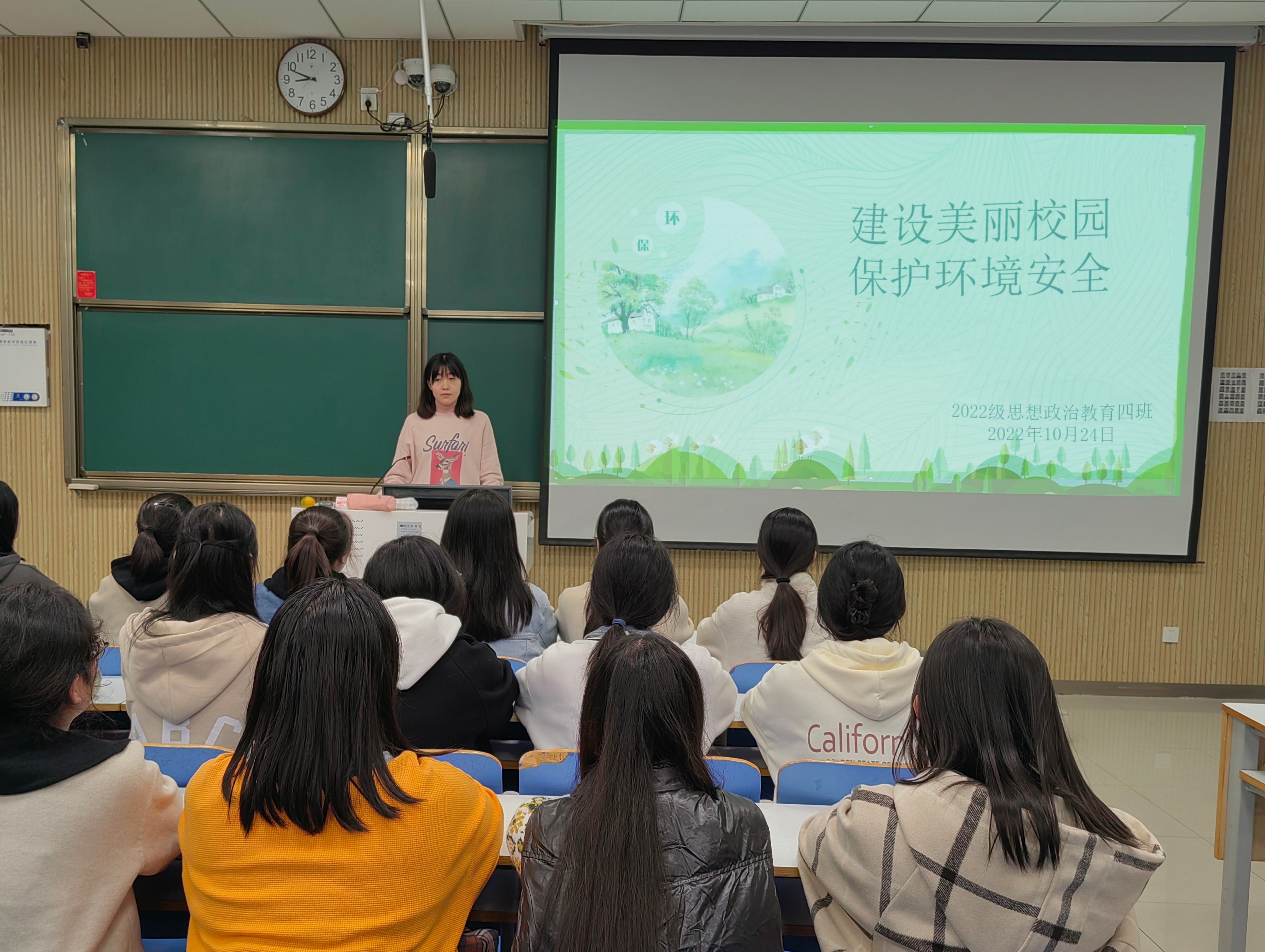为贯彻绿色发展理念,提高同学们的环保意识,10月24日下午,sjb世俱杯网站2022级思想政治教育四班在社科楼515教室召开“建设美丽校园,保护环境安全”主题班会。会议由文体委员周可盈主持。