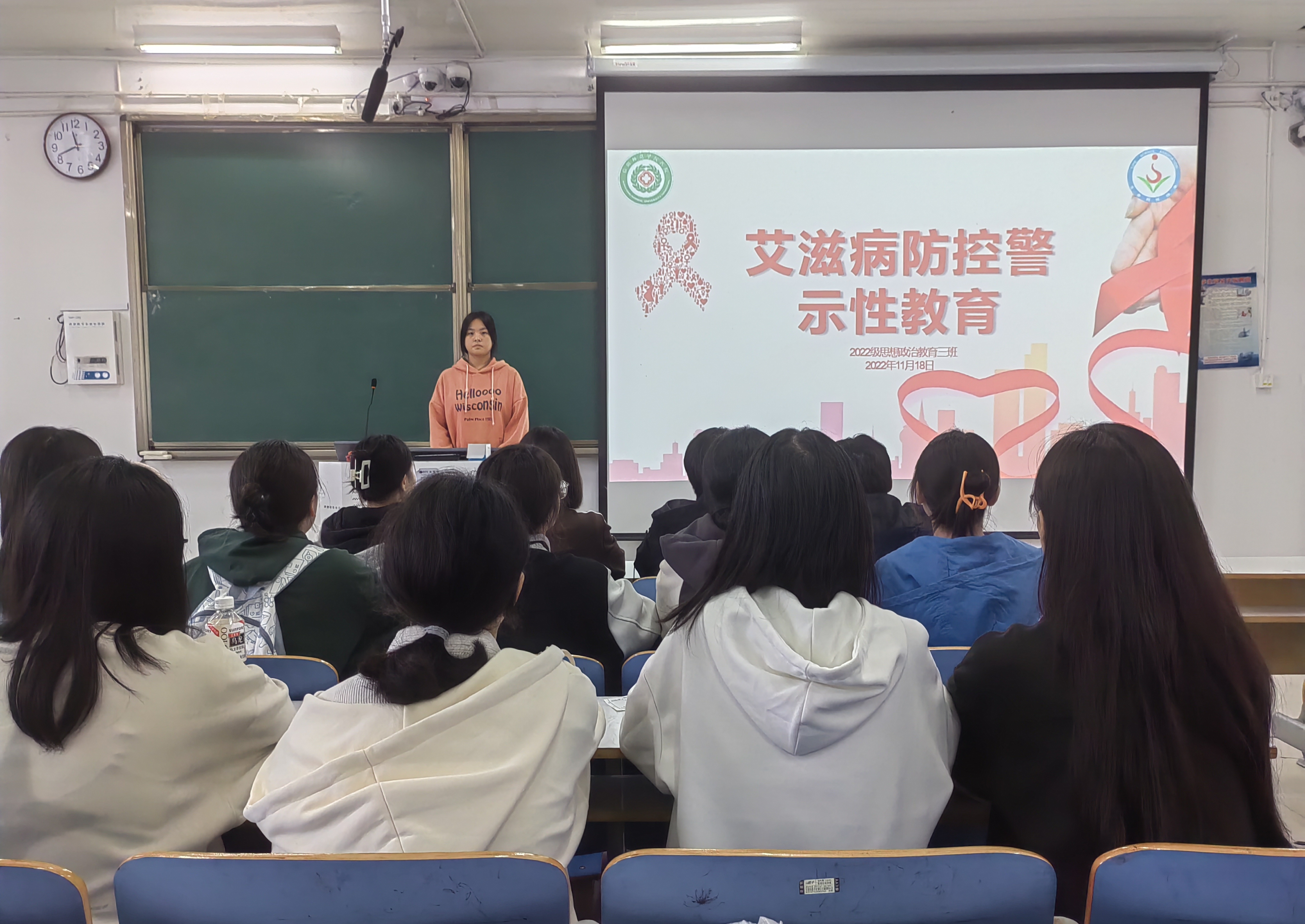 为宣传预防艾滋病知识,增强大学生安全意识和自我保护能力,11月18日上午,sjb世俱杯网站2022级思想政治教育三班在社科楼514教室召开艾滋病防控警示性教育主题班会。世俱杯官网2022级思想政治教育三班全体成员共同参加,班会由副班长雷露露主持。