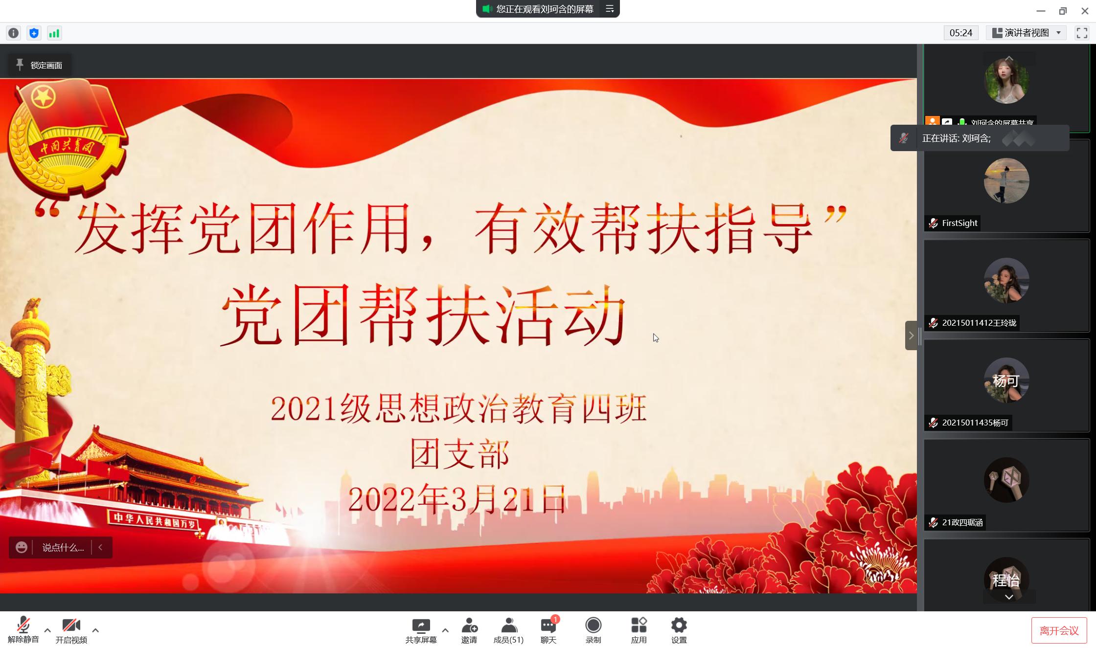 3月21日下午,sjb世俱杯网站2021级思想政治教育四班开展线上“发挥党团作用,有效帮扶指导”党团帮扶活动。辅导员高小佳、预备党员王晓鹭、姚勇毅及2021级思想政治教育四班全体团员共同参加此次活动。活动由团支书刘珂含主持。