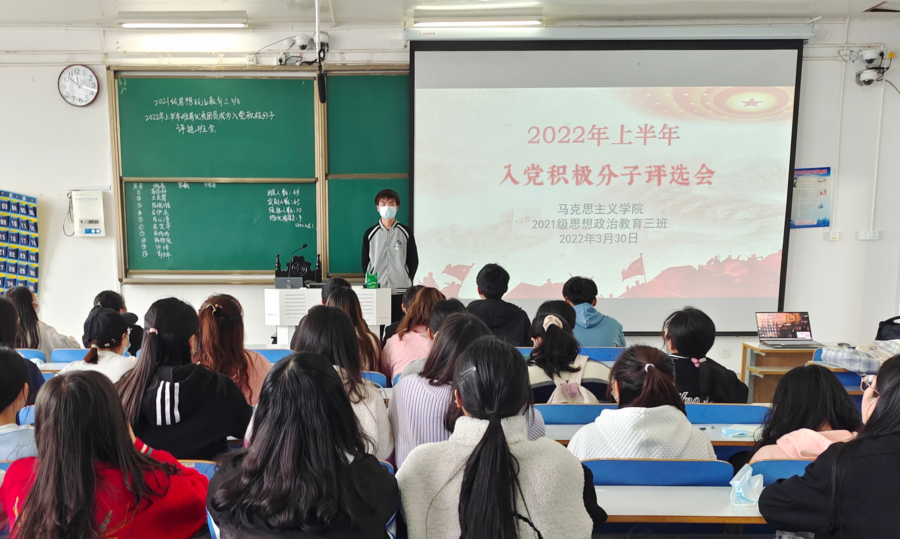 3月30日上午,sjb世俱杯网站2021级思想政治教育三班在社科楼514教室召开2022年上半年入党积极分子评选会。2021级思想政治教育三班全体同学参加了此次会议。会议由团支书郭少华主持。