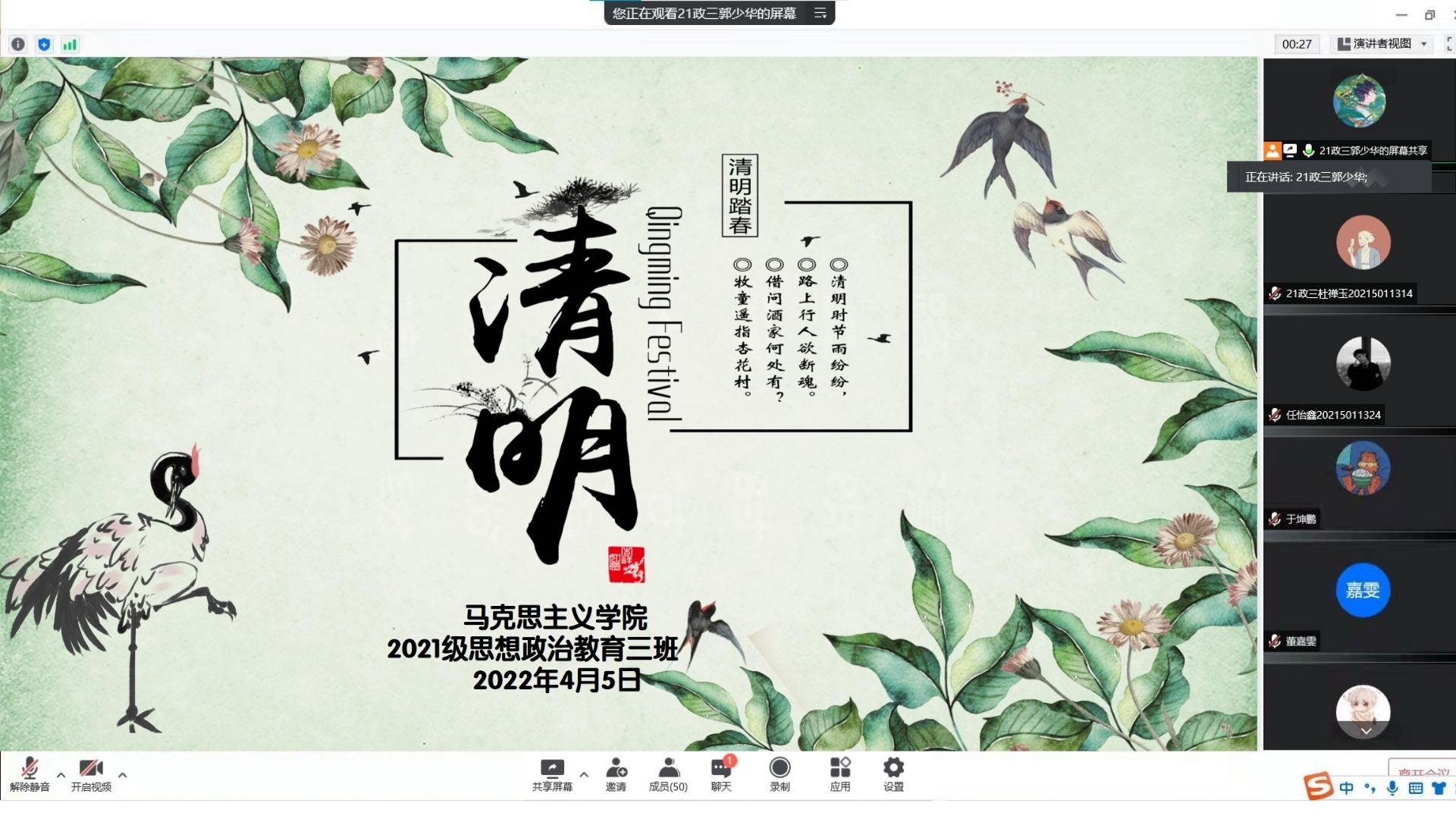 4月5日晚上,sjb世俱杯网站2021级思想政治教育三班召开线上“清明踏春,缅怀先烈”主题团课。2021级思想政治教育三班全体团员参加此次团课。团课由团支书郭少华主持。