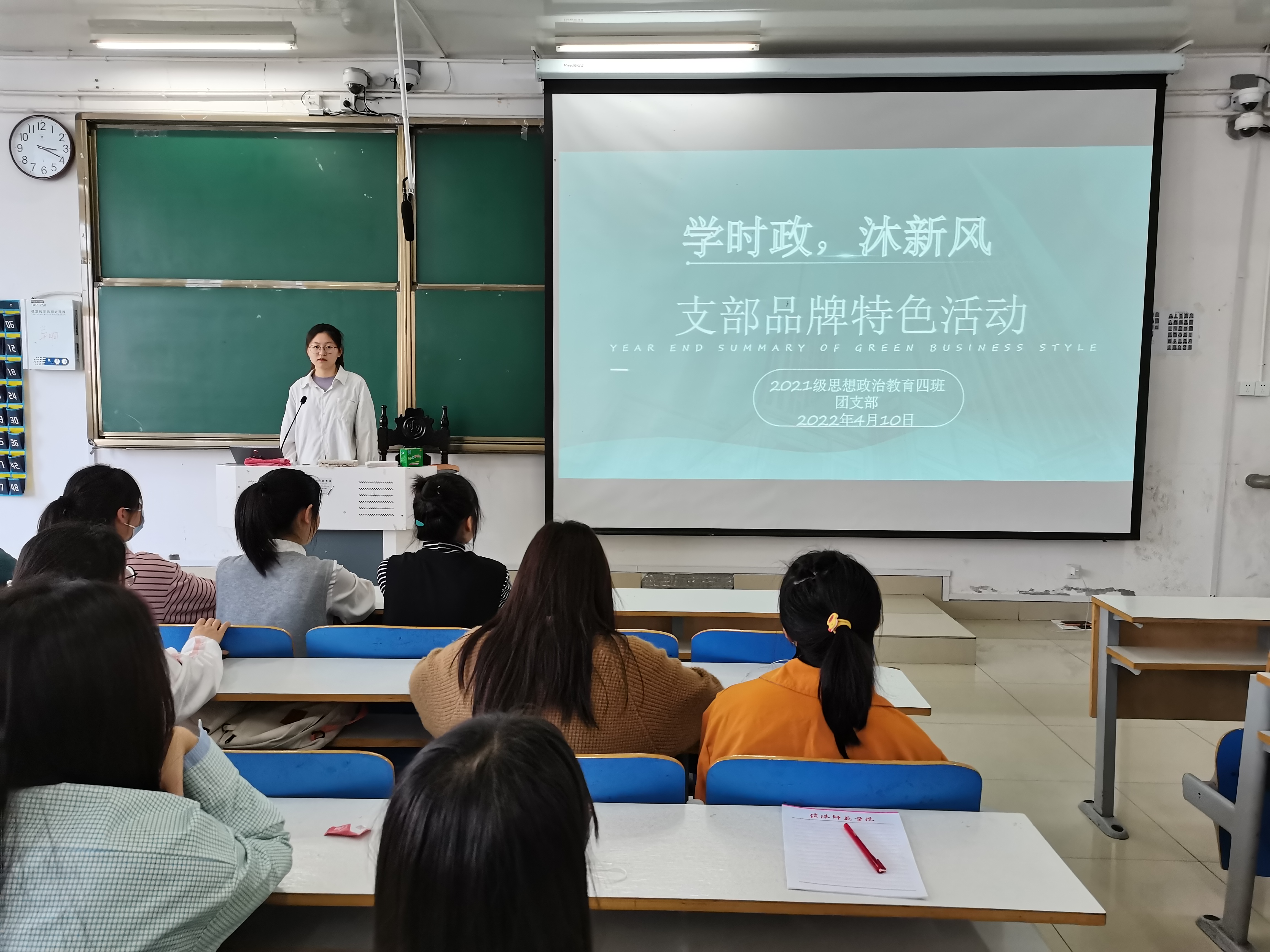 4月10日上午,sjb世俱杯网站2021级思想政治教育四班团支部在社科楼516教室开展“学时政,沐新风”品牌特色活动。2021级思想政治教育四班全体团员共同参与本次活动,活动由团支书刘珂含主持。