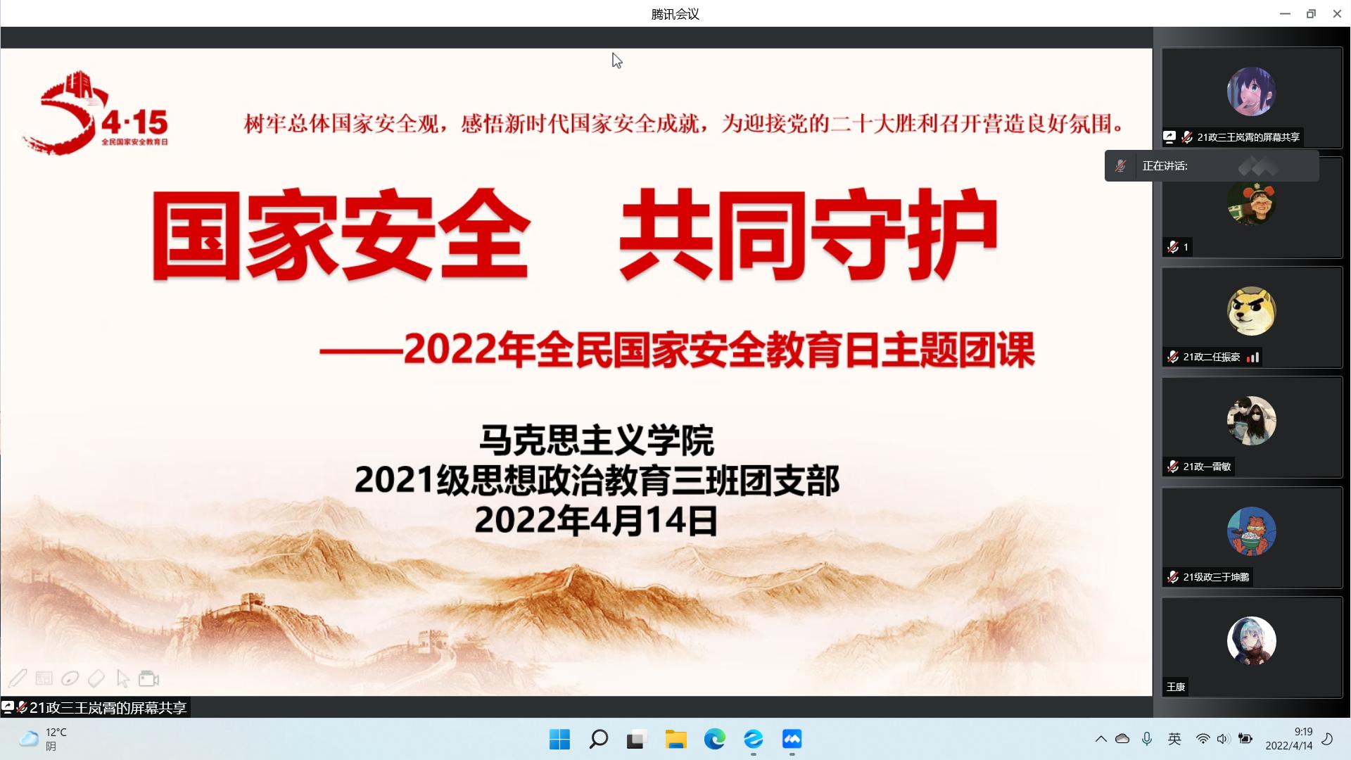 4月14日上午,sjb世俱杯网站2021级思想政治教育三班召开线上“国家安全,共同守护”主题团课。2021级思想政治教育三班全体团员参加此次团课。团课由团支部副书记王岚霄主持。