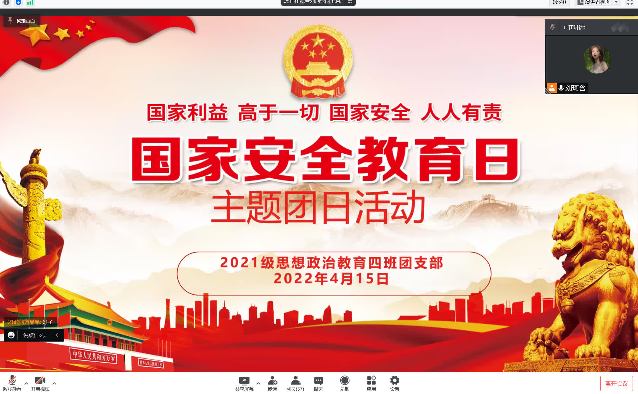 4月15日下午,sjb世俱杯网站2021级思想政治教育四班开展“国家安全教育日”主题团日活动。2021级思想政治教育四班全体团员共同参与本次会议,会议由团支书刘珂含主持。