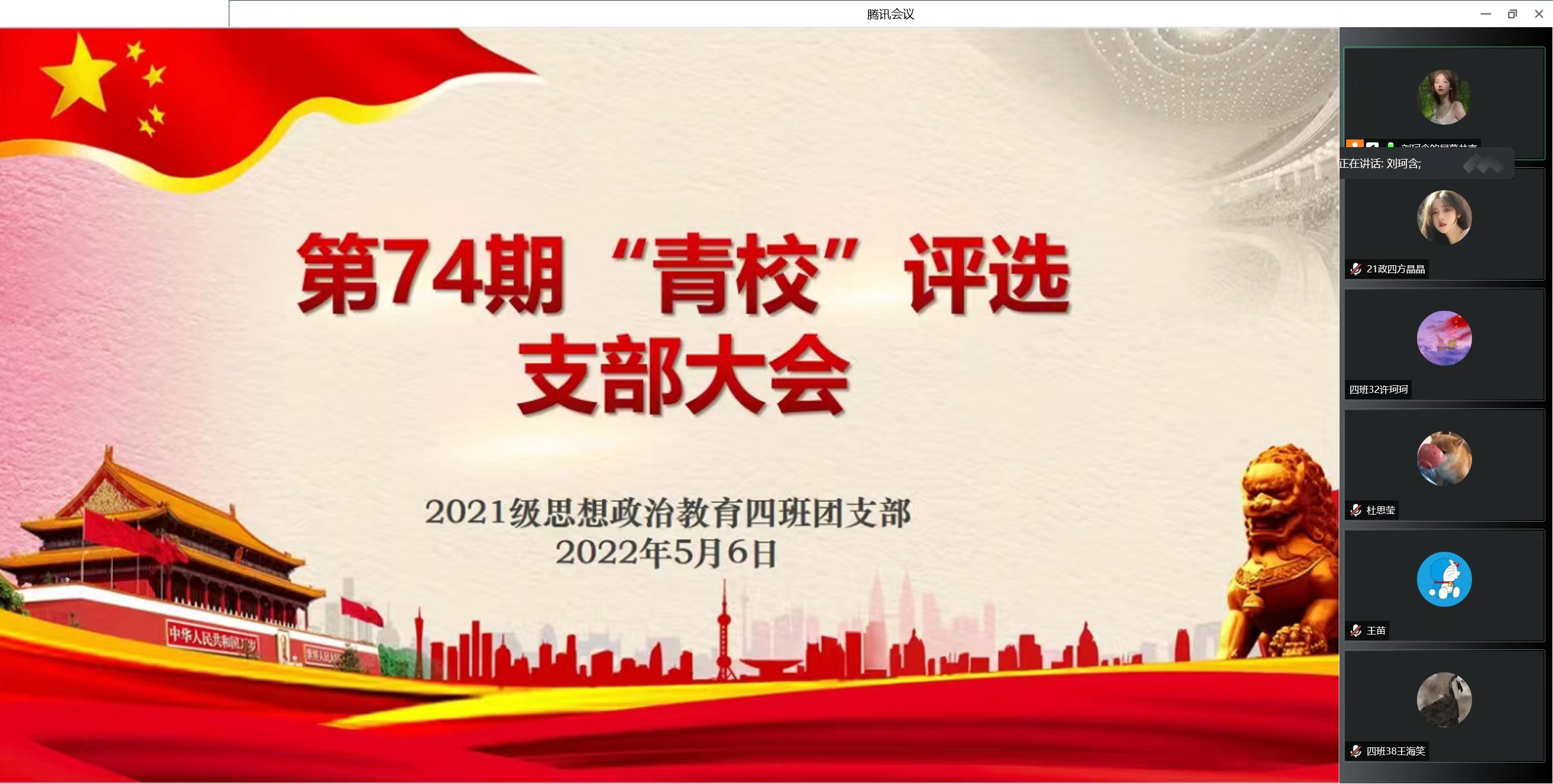 5月6日下午,sjb世俱杯网站2021级思想政治教育四班线上召开第74期青校评选支部大会。sjb世俱杯网站2021级思想政治教育四班全体成员共同参与本次会议。会议由团支书刘珂含主持。