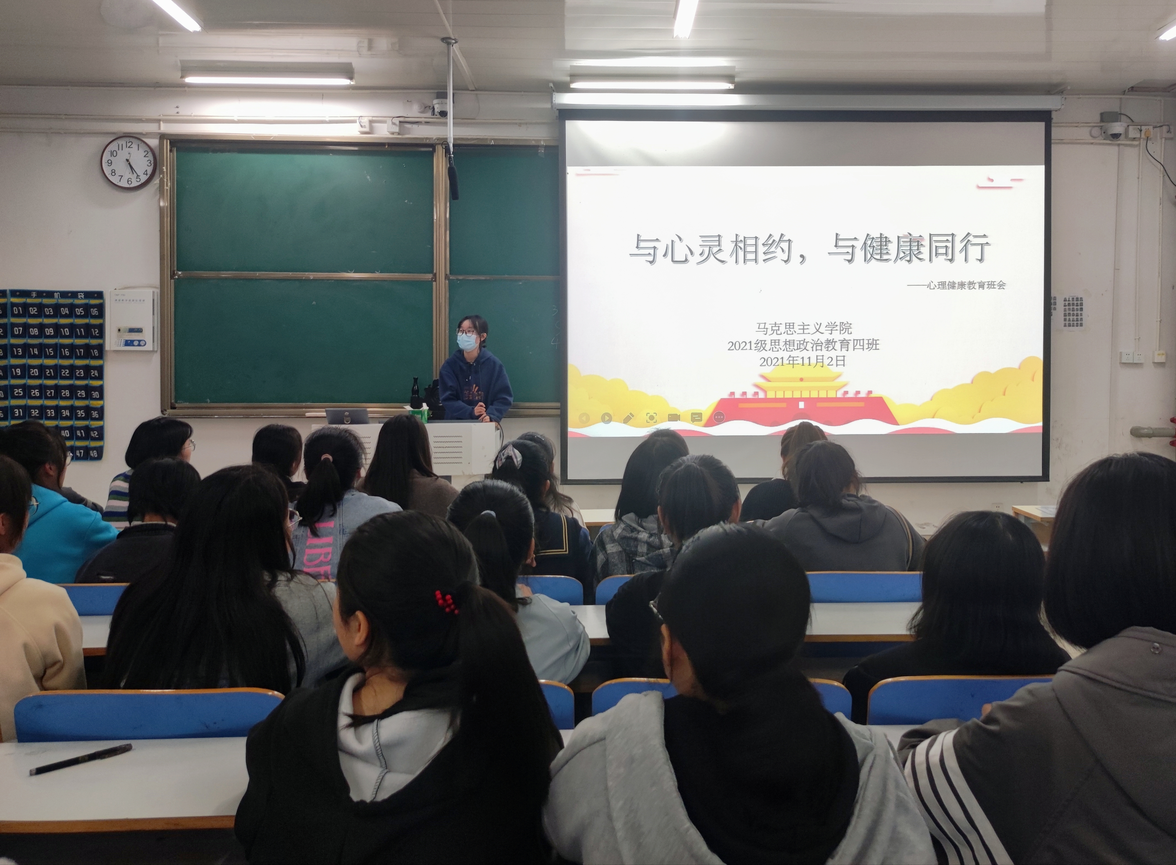 为了普及心理知识,营造班级良好氛围。11月2日上午,sjb世俱杯网站2021级思想政治教育四班“与心灵相约,与健康同行”主题班会在社科楼516教室顺利开展。2021级思想政治教育四班全体同学参加了本次班会。班会由心理委员杨可主持。