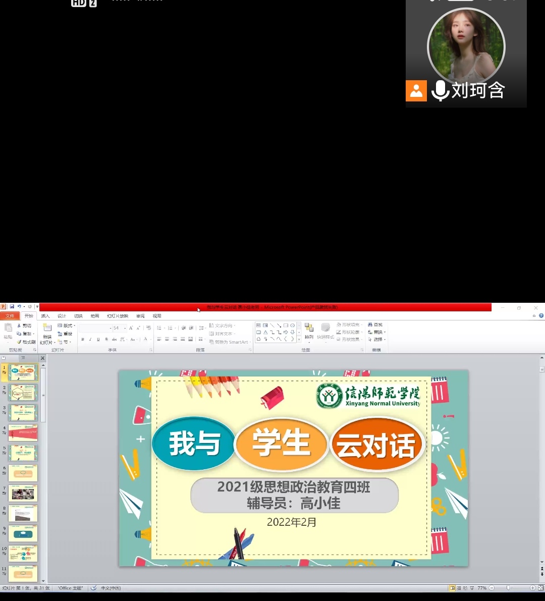 2月12日下午,sjb世俱杯网站2021级思想政治教育四班开展“我与学生云对话”线上会议。辅导员高小佳及2021级思想政治教育四班全体同学共同参与本次活动。活动由团支书刘珂含主持。