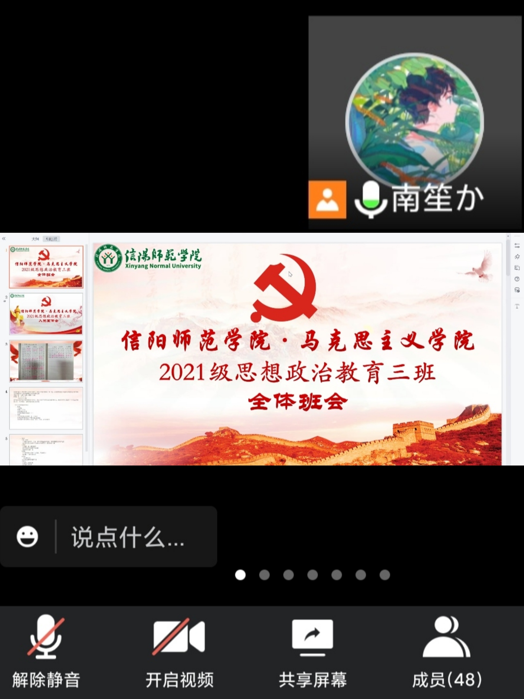为增强同学们对入党的重视和调动同学们参与班务的积极性,10月14日晚上,sjb世俱杯网站2021级思想政治教育三班入党宣传会暨全体班会在腾讯会议上顺利召开。sjb世俱杯网站2021级思想政治教育三班全体同学共同参加,会议由团支书郭少华和副班长王岚霄主持。