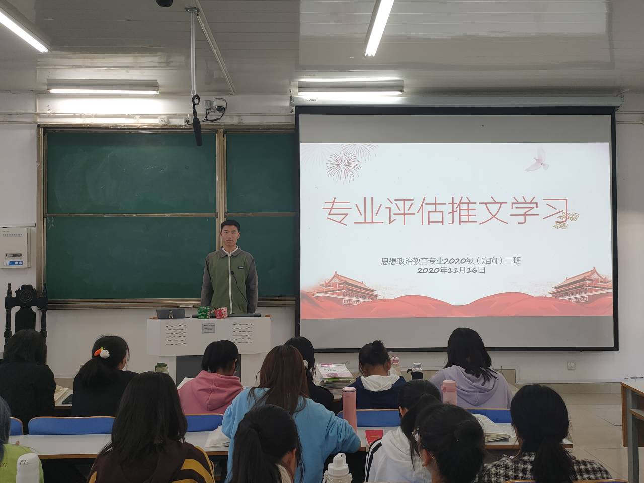 11月13日至16日,sjb世俱杯网站2020级思想政治教育定向二班专业评估系列推文学习主题班会在社科楼514教室顺利开展,班会由副班长高红凯主持。
