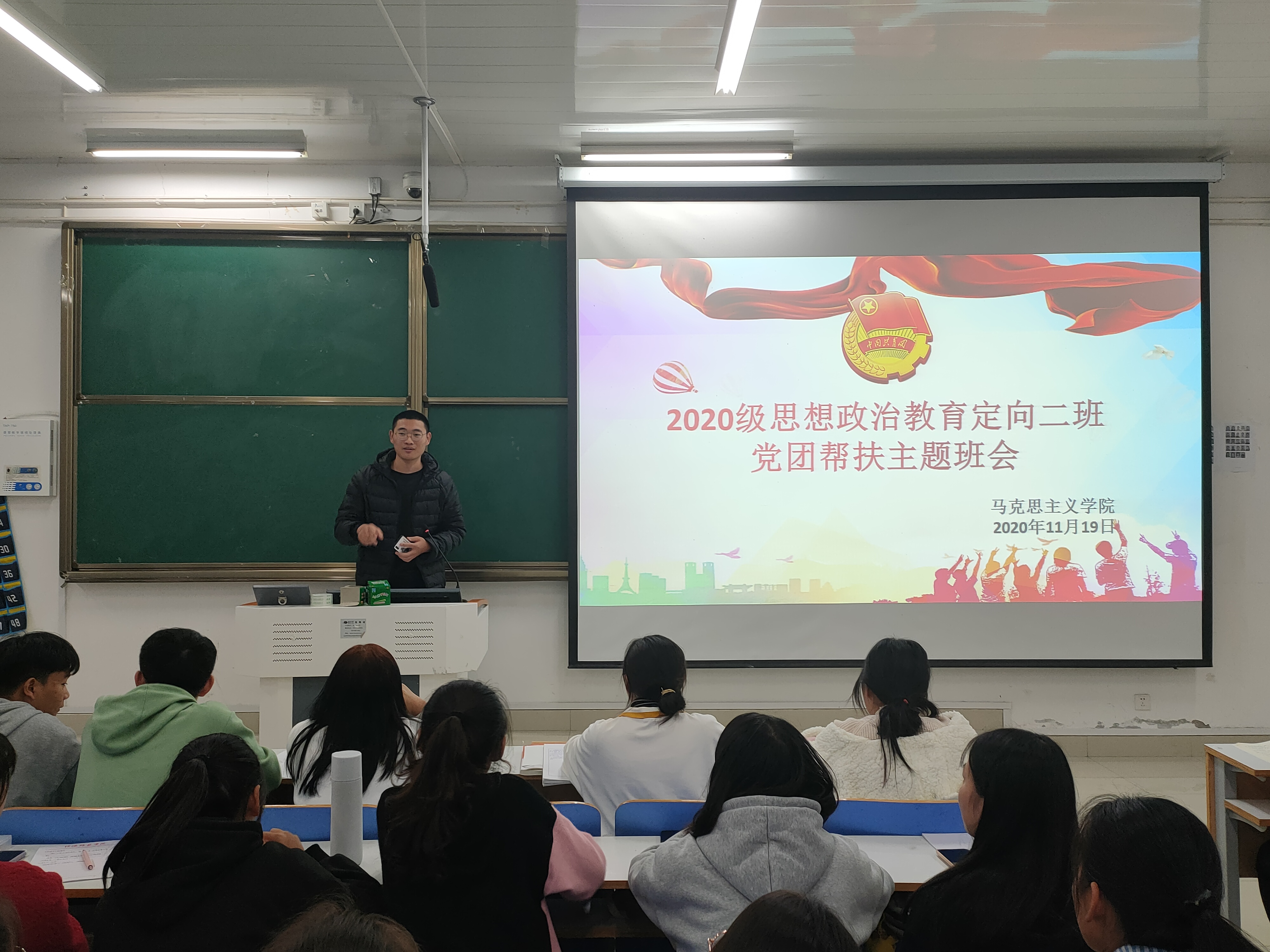 11月19日,sjb世俱杯网站2020级思想政治教育定向二班党团帮扶主题班会在社科楼516教室顺利召开。2018级预备党员代表杨康、张甜甜与思政定向二班全体同学共同参与本次班会。班会由团支书李晨曦主持。