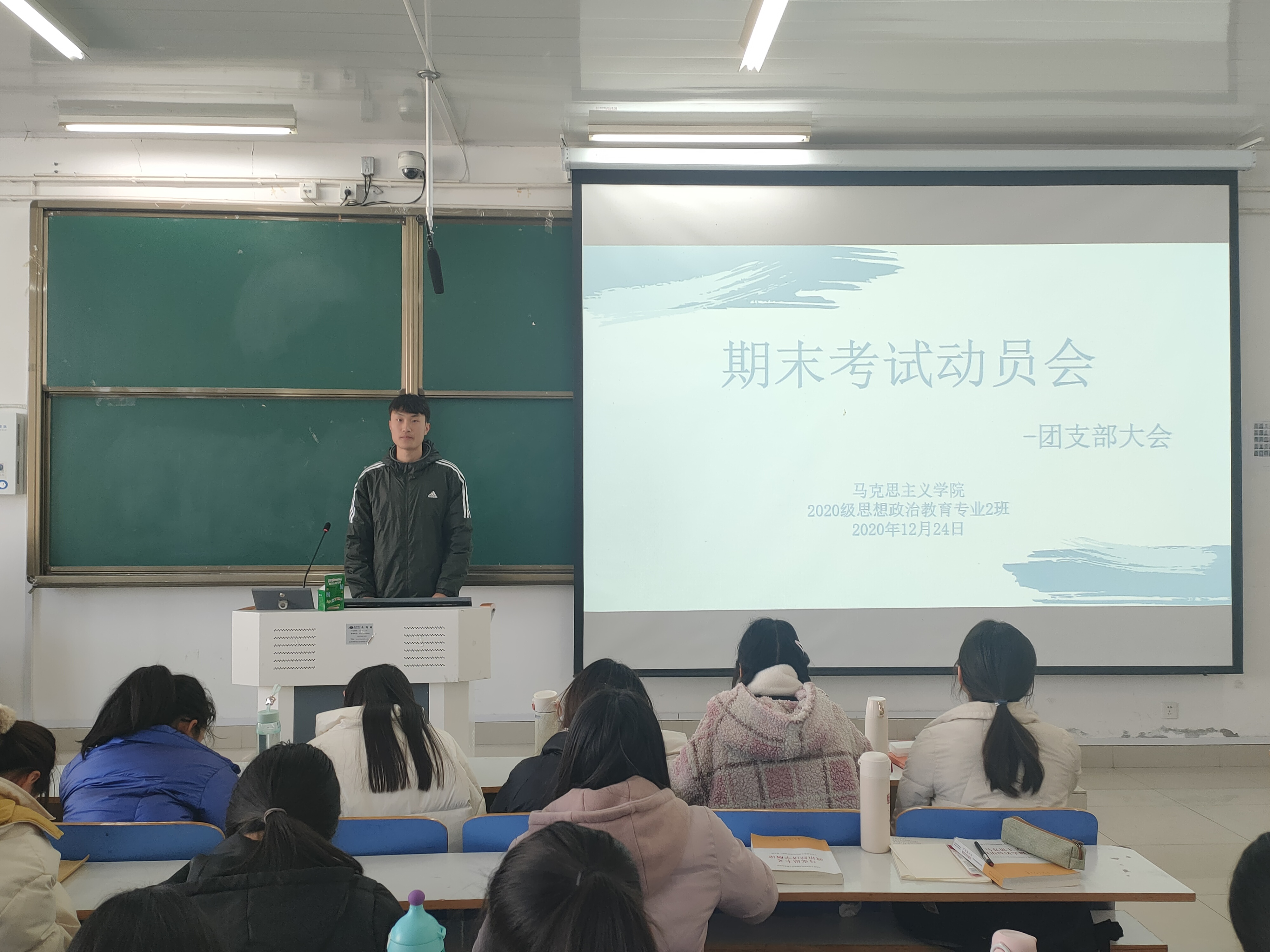 12月24日上午,sjb世俱杯网站2020级思想政治教育二班、(定向)二班在社科楼516教室顺利召开期末考试动员会。2020级思想政治教育二班、(定向)二班全体学生共同参与此次会议。会议由李晨曦、陈宇航主持。