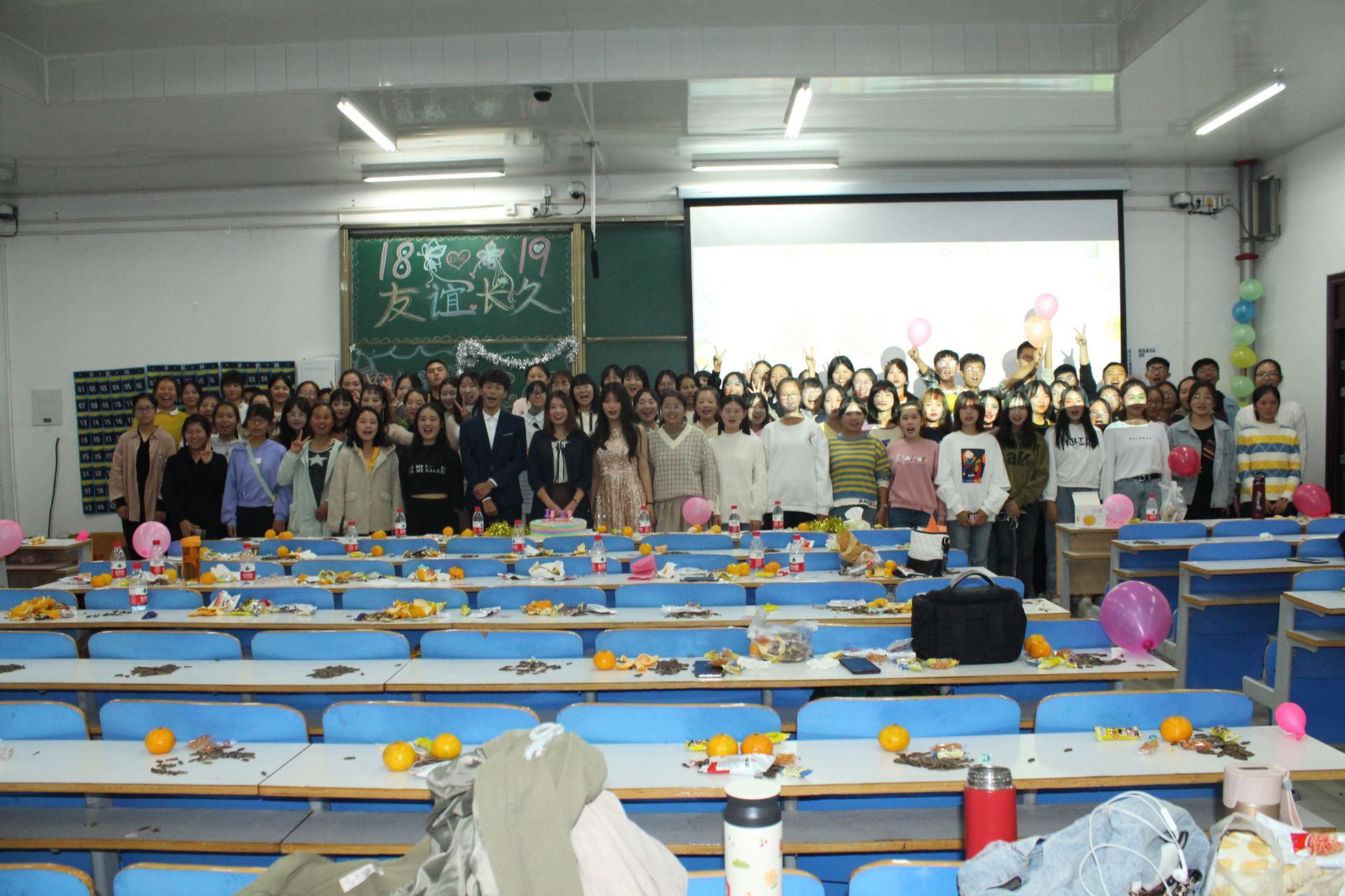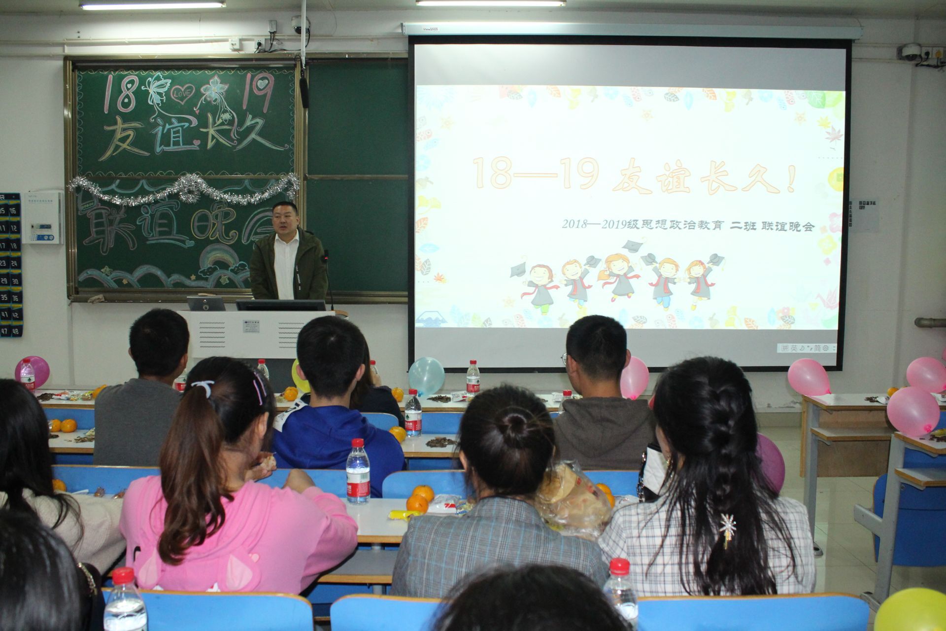 10月20日晚,sjb世俱杯网站“18、19友谊长久”思想政治教育二班联谊晚会在社科楼516教室隆重举行。sjb世俱杯网站党委副书记何晓坚、团委老师陶青青及2018、2019级思政二班全体学生共同观看了本场晚会。晚会由张靖茹、吕昂主持。