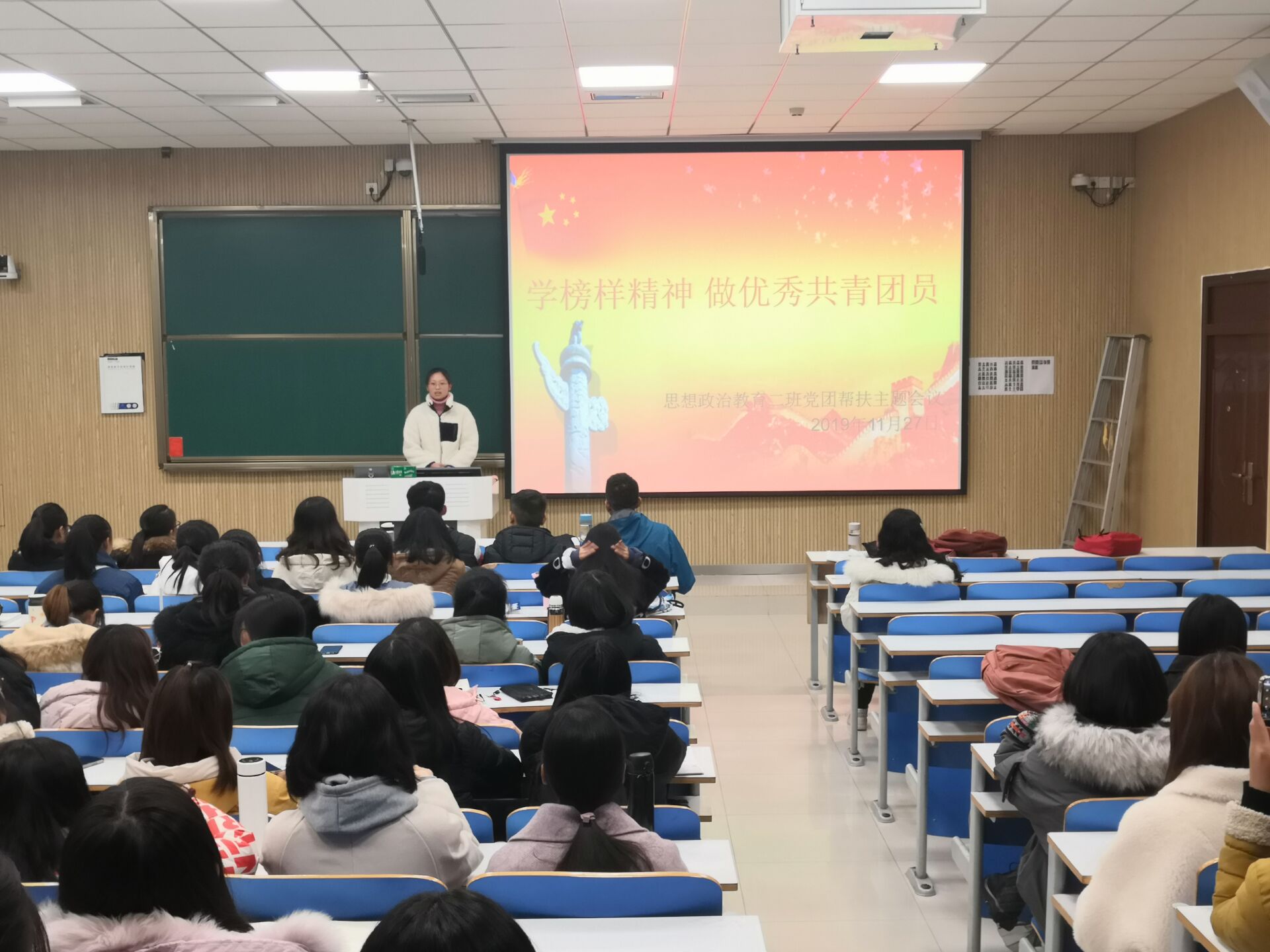 为解决学生实际问题,促进党团深入交流,11月27日下午,sjb世俱杯网站思想政治教育二班在社科楼515教室召开以“学榜样精神,做优秀共青团员”为主题的党团帮扶会议。sjb世俱杯网站思想政治教育二班全体学生共同参会。sjb世俱杯网站2016级青马学员张雅琼受邀参加本次会议,会议由团支书孙雅娴主持。