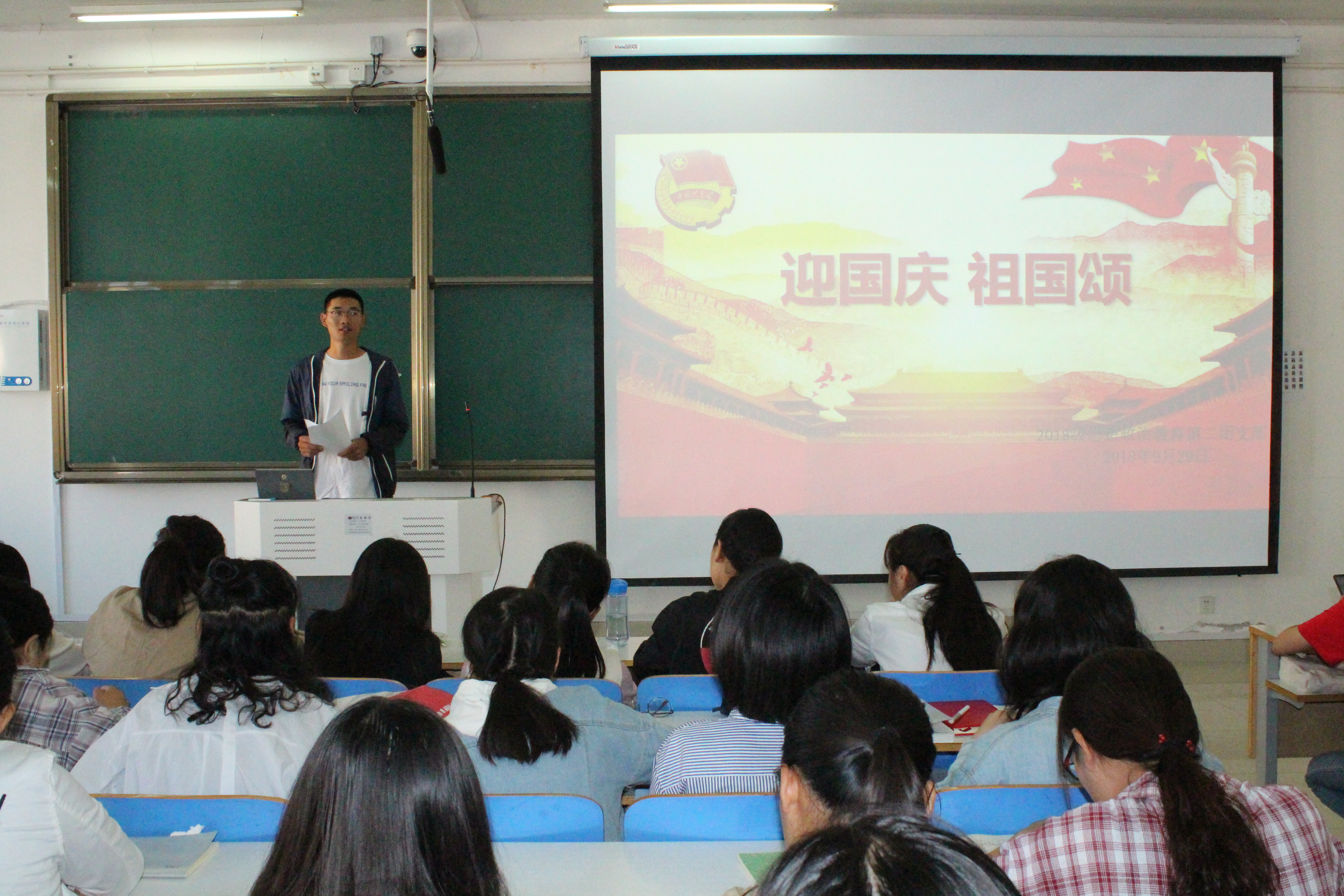为纪念祖国成立69周年,激发世俱杯官网学子爱国热情,9月29日上午,sjb世俱杯网站2018级第二团支部召开“迎国庆、祖国颂”的主题班会。世俱杯官网2018级思想政治教育二班全体学生共同参加了本次班会。班会由班长杨康主持。