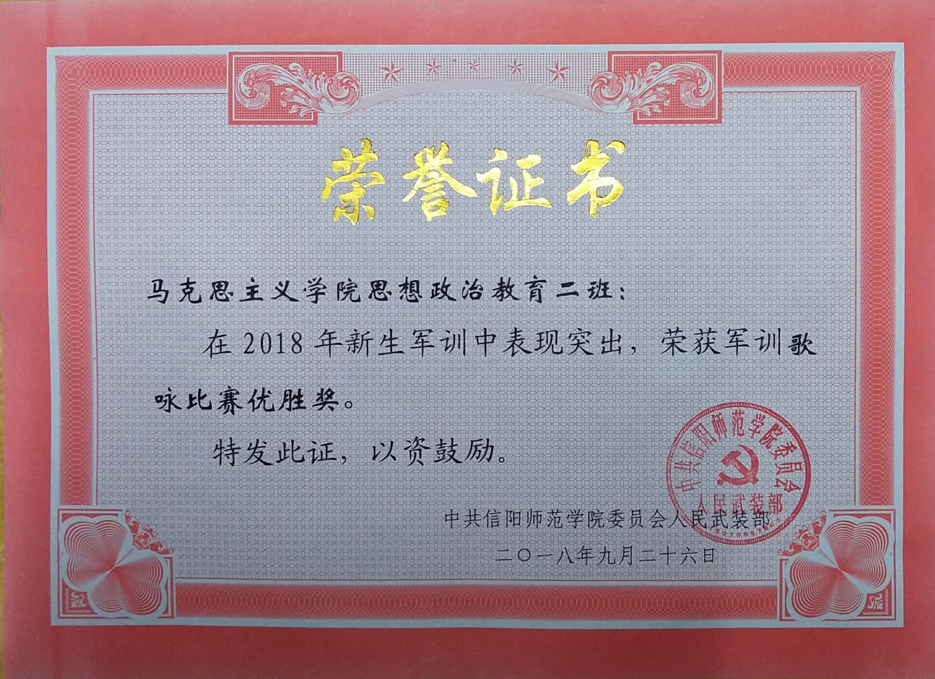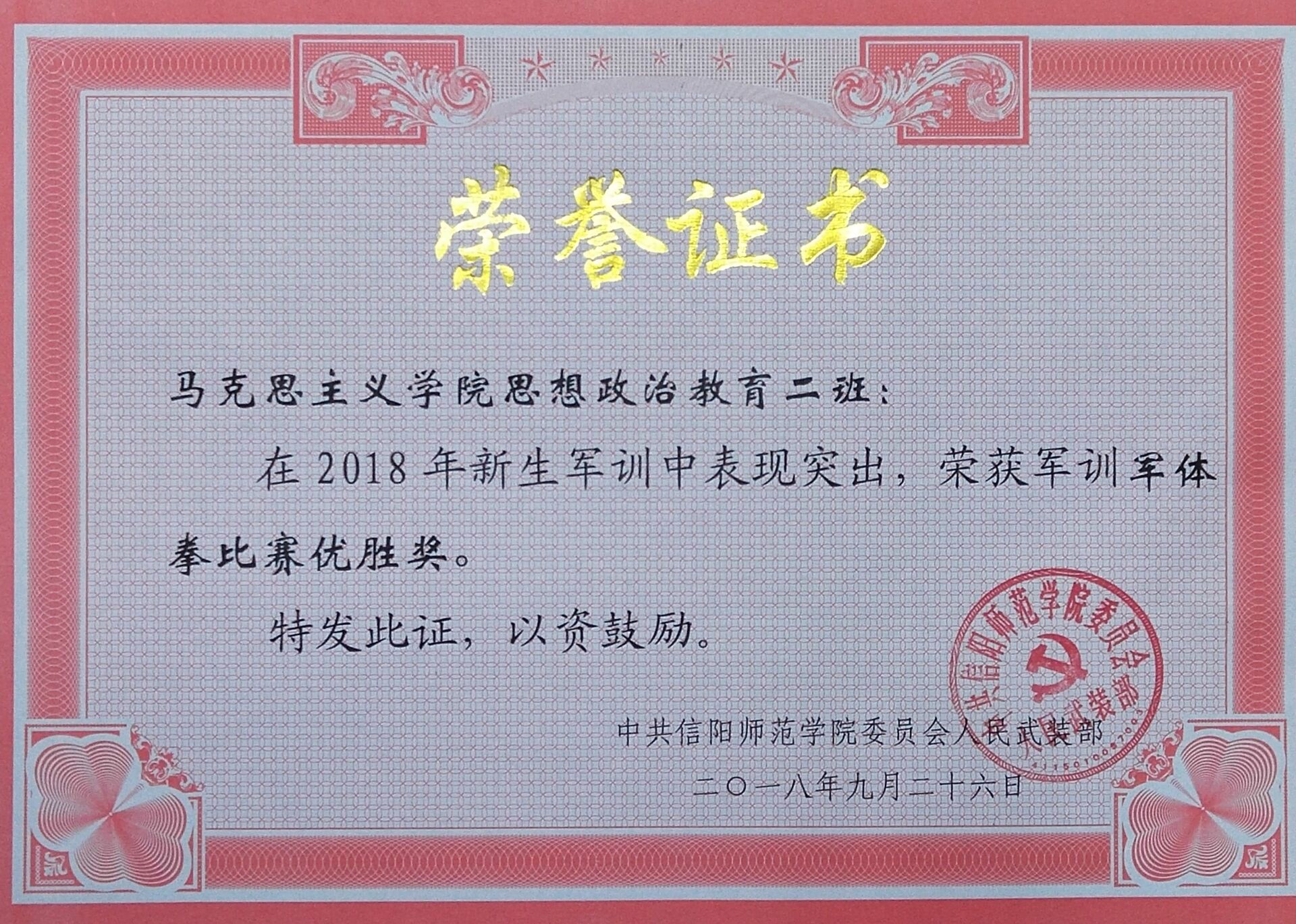 红旗猎猎,军歌嘹亮。9月26日上午,信阳师范学院2018级新生军训成果检验暨表彰大会在西操场召开。我校领导和教官们检阅了各军训方阵。在检阅过程中,由世俱杯官网的新生组成的军训受阅方队迈着整齐的步伐,喊着响亮的口号,个个军容整肃,雄姿英发,充分展示了2018级sjb世俱杯网站新生昂扬向上的精神面貌。接着,全体2018级新生进行唱军歌、打军体拳等科目展示,展现了同学们的军训成果,尽显高昂士气。在表彰大会上,sjb世俱杯网站2018级思想政治教育二班荣获军训歌咏比赛优胜奖和军体拳比赛优胜奖。除此,杨康、黄子晋被授予军训先进个人的称号。