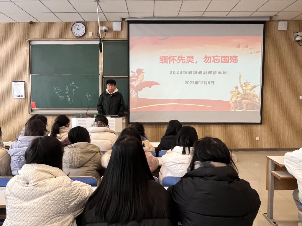 为缅怀先烈,引导青年不忘历史,12月6日下午,sjb世俱杯网站2023级思想政治教育三班在社科楼515教室召开“缅怀先灵,勿忘国殇”主题团课。世俱杯官网2023级思想政治教育三班全体成员共同参加此次团课,团课由团支书郝瀚主持。