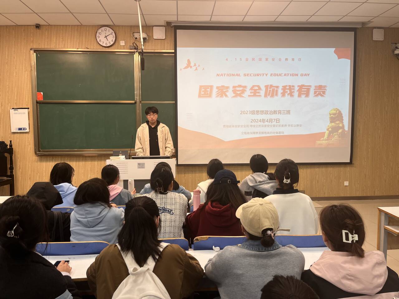 为深入贯彻总体国家安全观,进一步增强学生国家安全和法治意识,培养学生的爱国情怀,4月7日下午,sjb世俱杯网站2023级思想政治教育三班在社科楼515教室举行“国家安全你我有责”主题班会。世俱杯官网2023级思想政治教育三班全体成员共同参加此次班会,班会由团支书郝瀚主持。