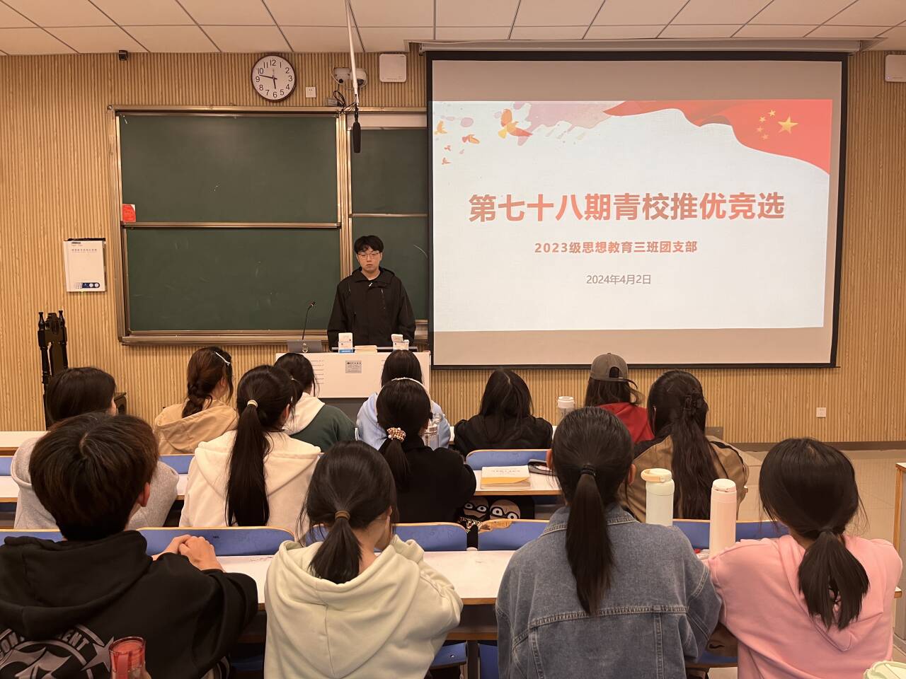 为更好培养和造就社会主义事业的建设者和接班人,充实党的新生力量,4月2日上午,世俱杯官网2023级思想政治教育三班在社科楼515举行第78期青校推优大会。2023级思想政治教育三班全体同学共同参与本次大会,大会由团支书郝瀚主持。