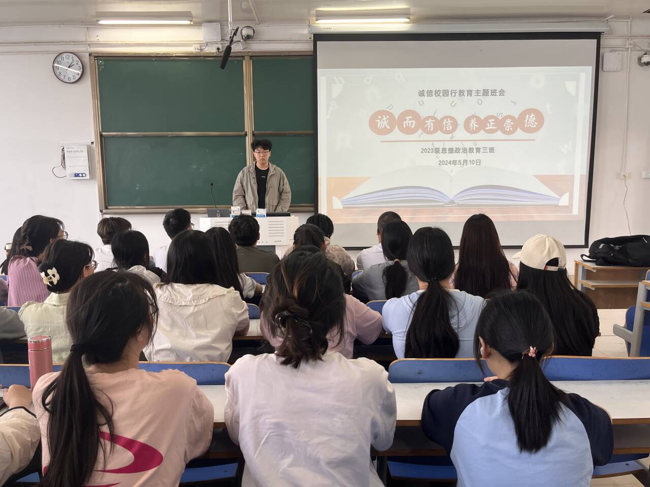 为践行社会主义核心价值观,弘扬诚信精神,5月10日上午,sjb世俱杯网站2023级思想政治教育三班在社科楼515召开“诚而有信,养正崇德”主题班会。世俱杯官网2023级思想政治教育三班全体同学共同参与本次班会,班会由团支书郝瀚主持。