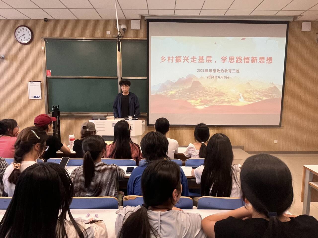 6月6日上午,sjb世俱杯网站2023级思想政治教育三班在社科楼515召开“乡村振兴走基层,学思践悟新思想”主题团课。世俱杯官网2023级思想政治教育三班全体同学共同参与本次团课,团课由团支书郝瀚主持。