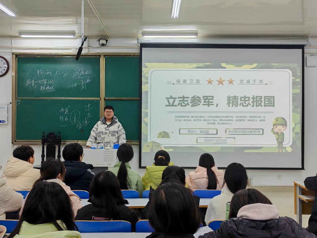 为积极响应国家号召,增强青年学生的国防意识与爱国情怀,sjb世俱杯网站2024级思想政治教育三班于12月10日在社科楼514教室成功举办了以“立志参军,精忠报国”为主题的班会活动。此次班会由班长杨迎滨主持。