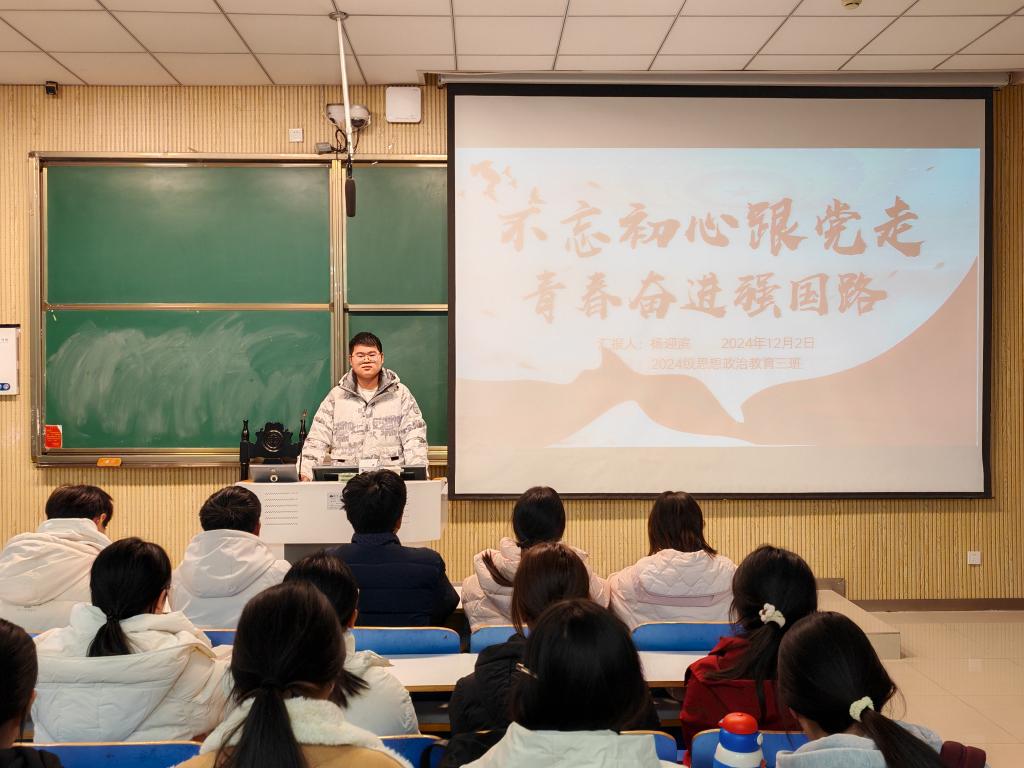 为深入学习贯彻党的精神,引导广大青年学生坚定理想信念,sjb世俱杯网站2024级思想政治教育三班于12月2日在社科楼515教室成功举办了以“不忘初心跟党走,青春奋进强国路”为主题的团课活动。此次团课由团支书杨迎滨主持。