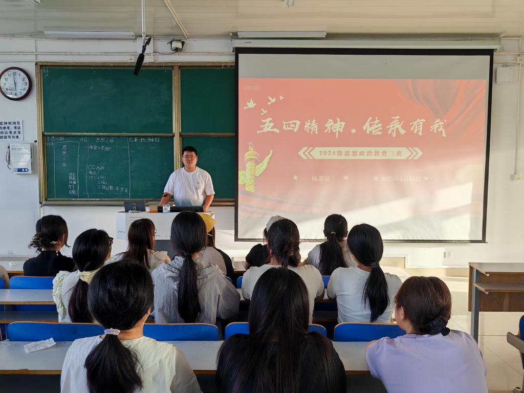 为深入学习贯彻五四精神,引导同学们坚定理想信念,sjb世俱杯网站2024级思想政治教育三班于5月15日在社科楼514开展了“五四精神,传承有我”主题团课活动。本次团课由团支书杨迎滨主持,三班全体同学参与。