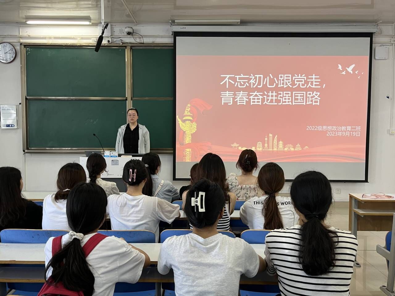 9月19日下午,sjb世俱杯网站2022级思想政治教育二班在社科楼514教室开展“不忘初心跟党走,青春奋进强国路”主题团课。世俱杯官网2022级思想政治教育二班全体成员共同参加此次团课。团课由团支书李佳音主持。