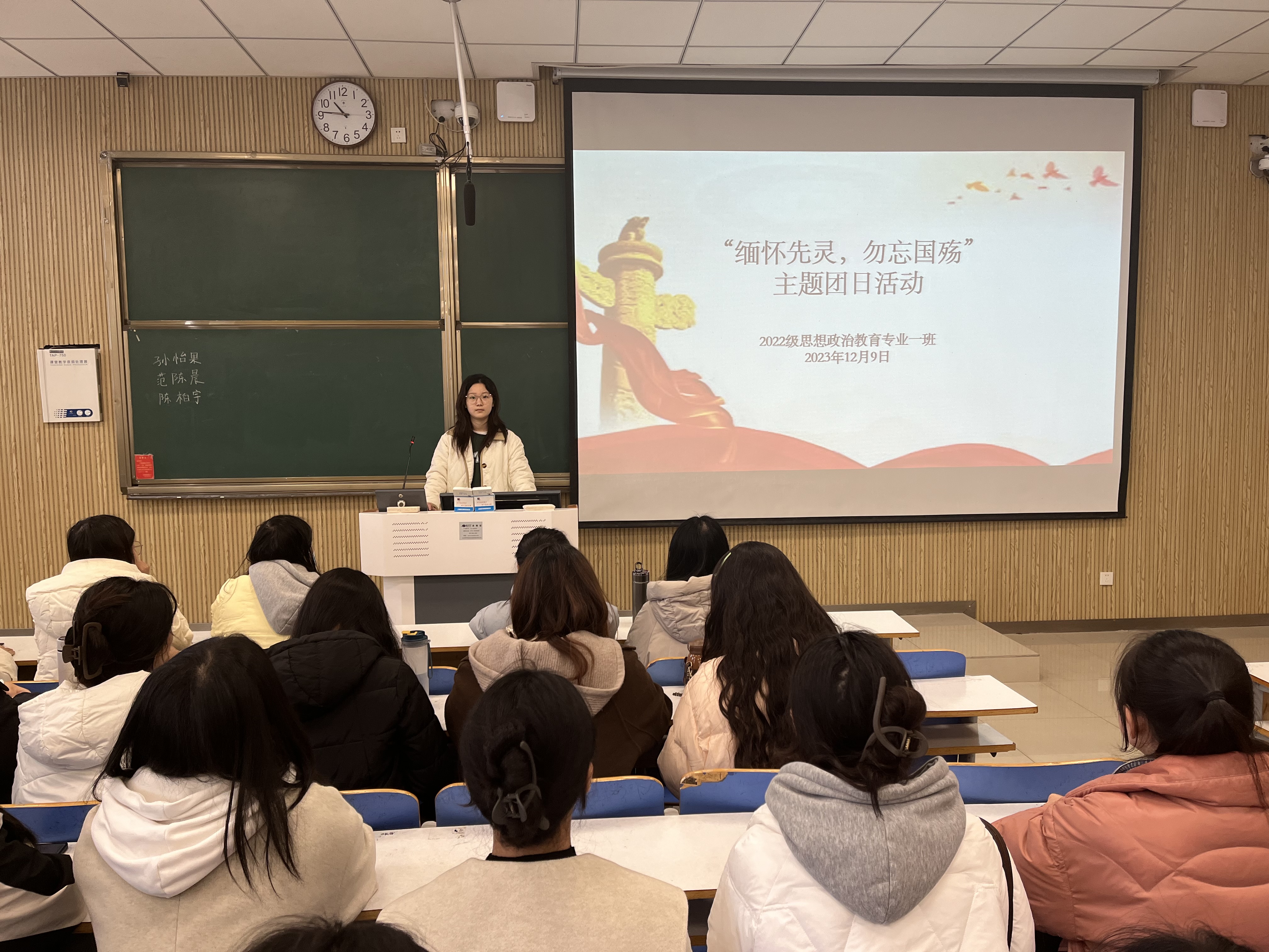 为推动同学们铭记历史,激发爱国热情,12月9日上午,sjb世俱杯网站2022级思想政治教育一班在社科楼515教室召开“缅怀先灵,勿忘国殇”主题团课。世俱杯官网2022级思想政治教育一班全体同学共同参与本次团课,团课由团支书李佳茹主持。
