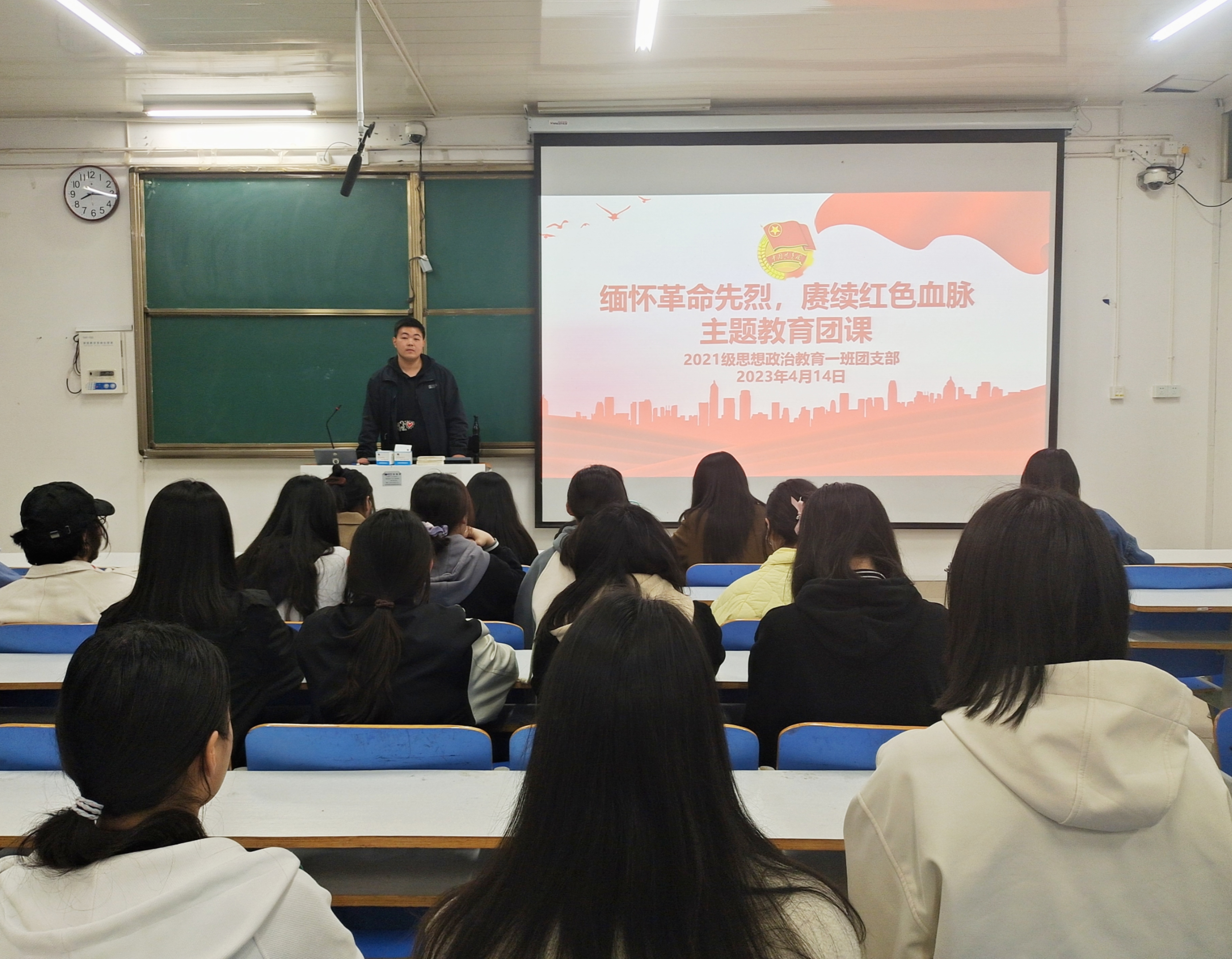 为缅怀革命先烈,加强对大学生爱国主义教育、革命传统教育和传统美德教育,强化大学生思想道德建设,4月14日晚上,sjb世俱杯网站2021级思想政治教育一班在社科楼514教室召开“缅怀革命先烈,赓续红色血脉”主题教育团课。2021级思想政治教育一班全体团员共同参加了本次团课。团课由团支书戴翰林主持。