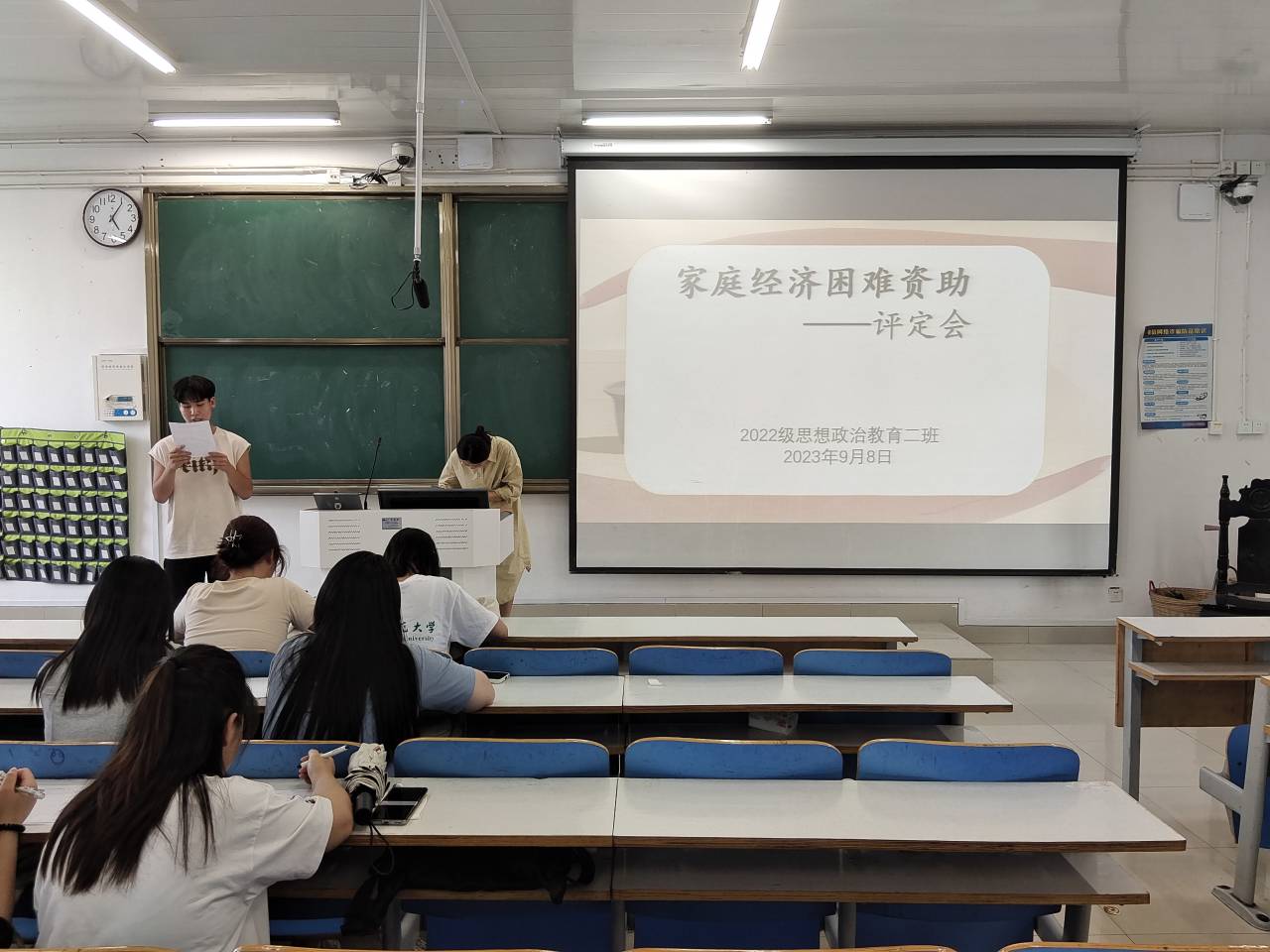 9月8日下午,sjb世俱杯网站2022级思想政治教育二班在社科楼514教室召开“家庭经济困难资助评定会”。世俱杯官网2022级思想政治教育二班杨春艳老师和全体同学参与本次评议会。副班长柴智森主持本次会议。