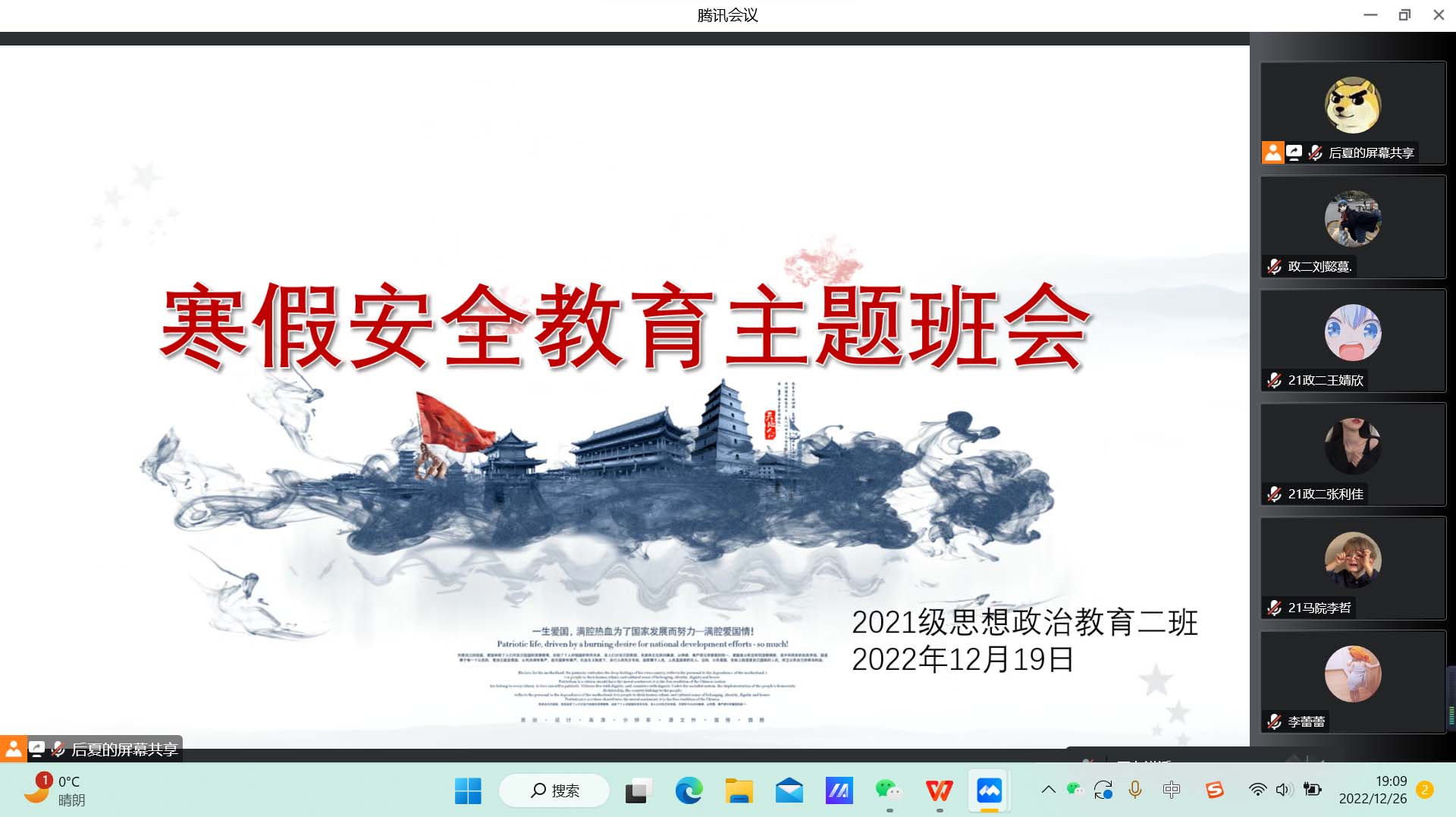 12月19日下午,sjb世俱杯网站2021级思想政治教育二班在腾讯会议召开寒假安全教育主题班会。2021级思想政治教育二班全体成员共同参加此次主题班会。班会由副班长任振豪主持。